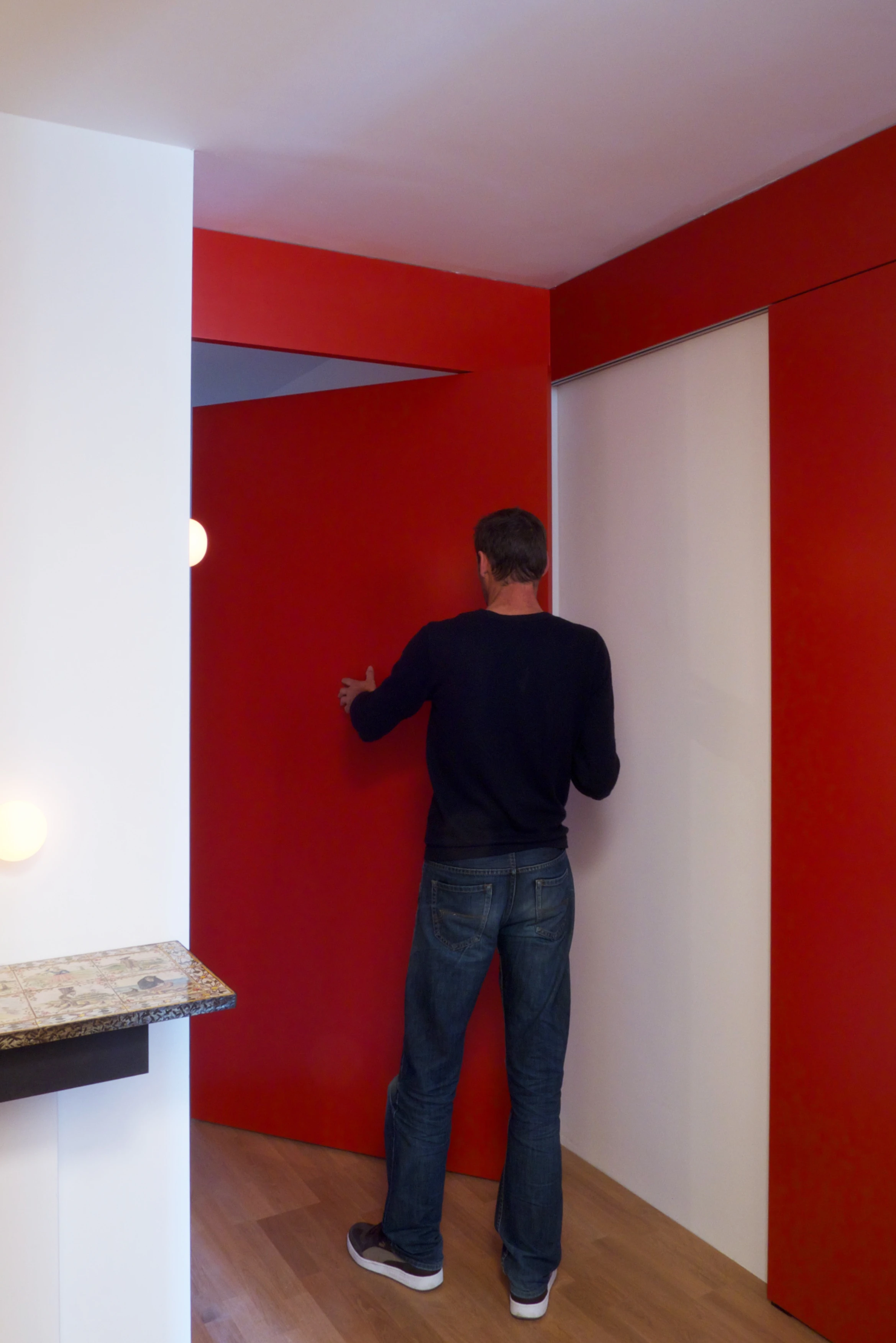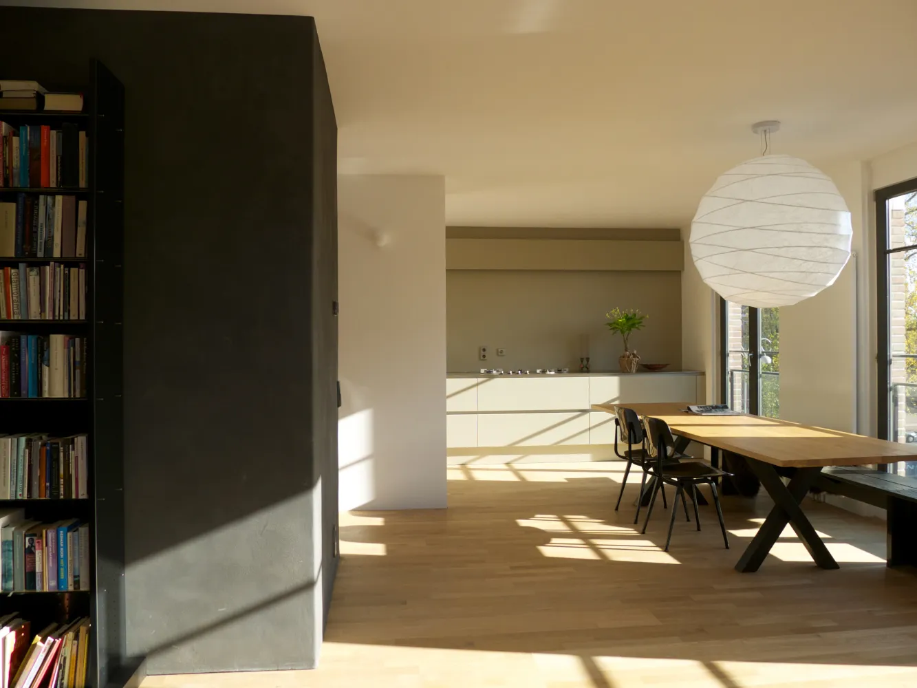 AMstudio heeft het nieuwbouwappartement volledig gestript om een licht en compact interieur te creëren. De ruimtes vloeien naadloos in elkaar over, terwijl er ook individuele plekken zijn om te ontspannen. De centrale hal fungeert als het hart van de woning en verbindt het voor- en achterdeel. Een draai- en schuifdeur, geïnspireerd door Rietveld, kan de zichtlijn openen of sluiten. Opvallend is de ruwe, donkere kern van leemstuc die als een solide element fungeert waar alles omheen draait. De keuken fungeert als één groot dressoir waaruit maaltijden worden geserveerd. De tafel met lage bank en de op maat gemaakte boekenkasten zijn een knipoog naar Manhattan, waar de bewoners eerder hebben gewoond. De zorgvuldig gekozen kleuren voegen accenten en sfeer toe aan het interieur. Kortom, deze woning is een harmonieuze samensmelting van twee geliefde werelden, waarin beide bewoners zich op hun eigen manier thuis voelen.