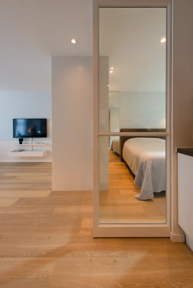 De woning is ingericht als een loft design en slim ingedeeld in verschillende compartimenten. Speciaal ontworpen kasten functioneren als wanden en zorgen voor een open, lichte uitstraling. Dankzij de zichtlijnen is er indirect contact met het dakterras, waardoor binnen en buiten naadloos in elkaar overlopen en de woning royaal oogt.