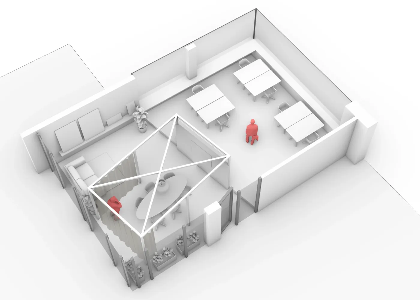 Duurzaam en huiselijk kantoorinterieur voor Radicle Crops Voor het internationale kantoor van Radicle Crops op de WUR-campus in Wageningen ontwierp AMstudio een inbouwinterieur dat zowel functioneel als persoonlijk herkenbaar is. De ruimte is afgestemd op de wensen van de gebruikers en sluit aan bij de huidige tijd, waarin hybride werken en videovergaderen centraal staan.