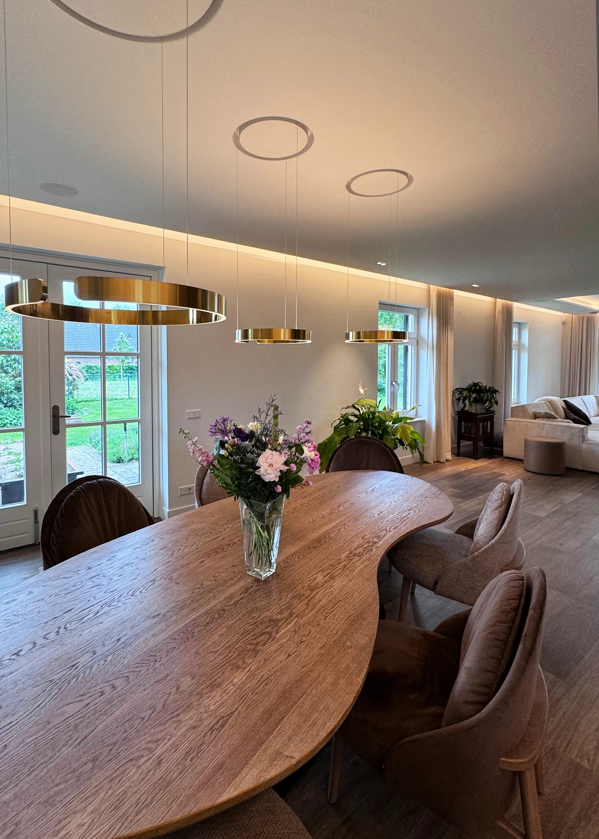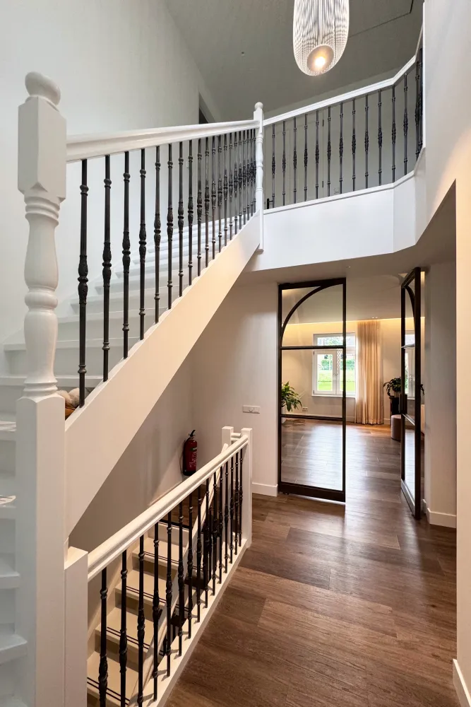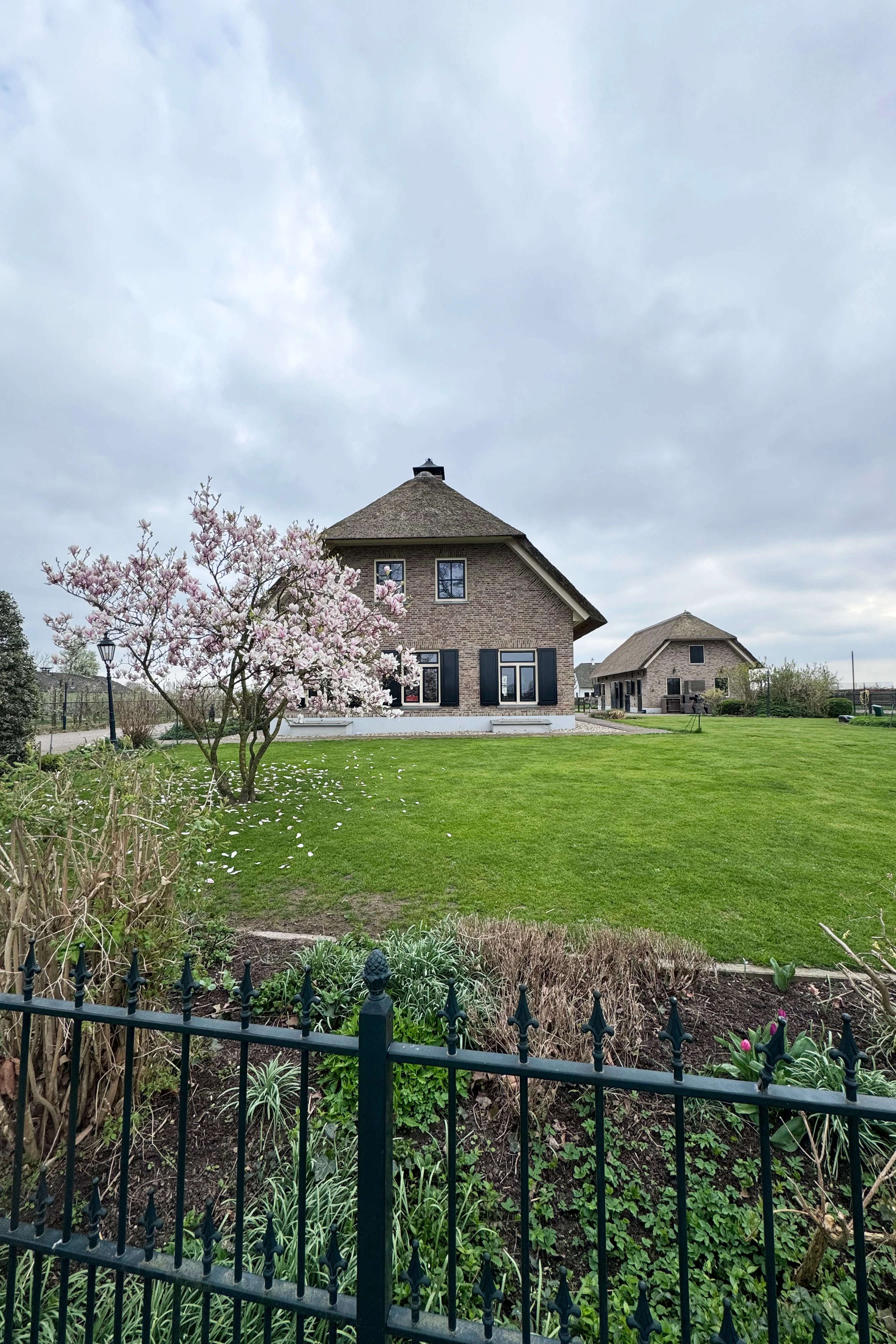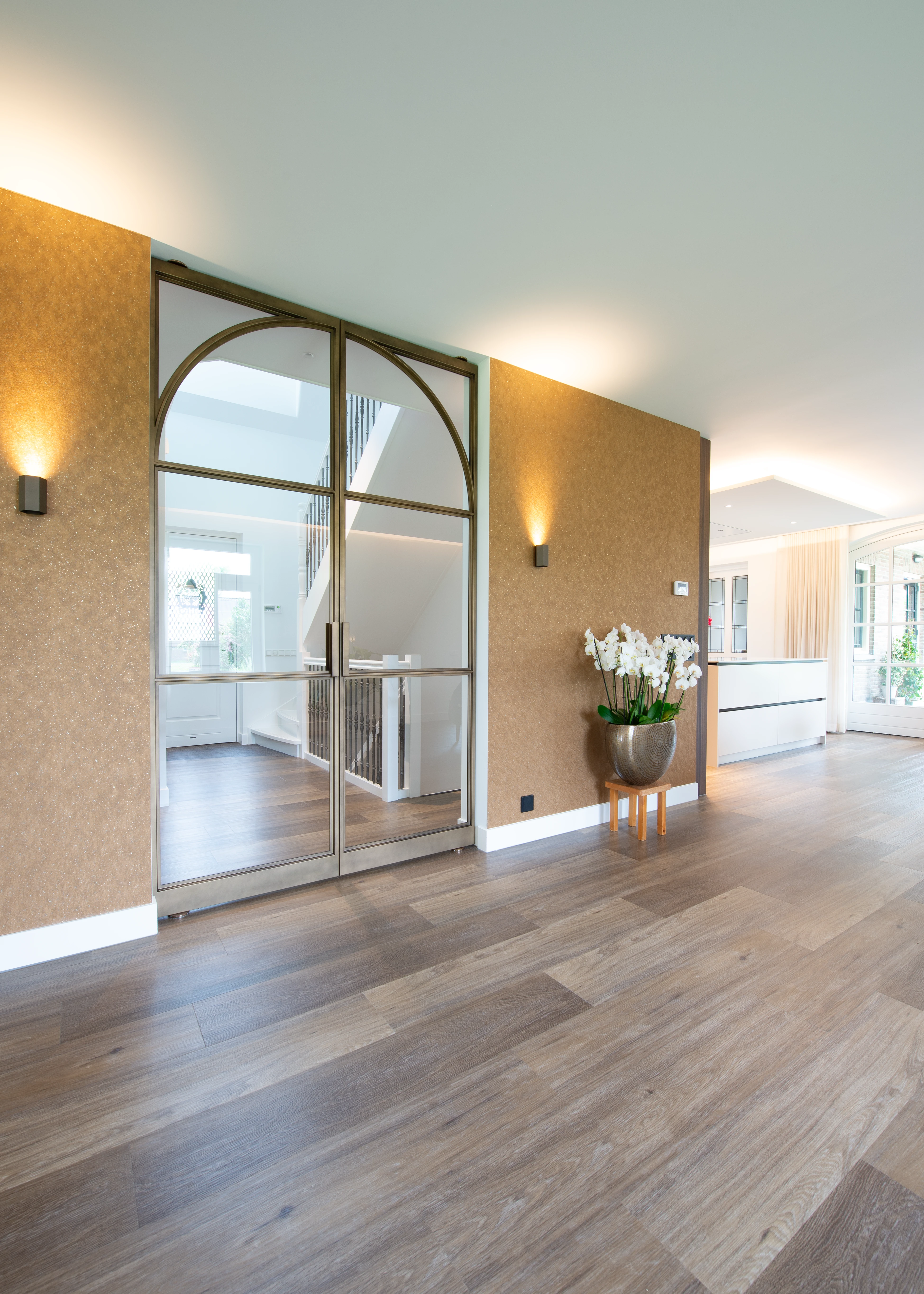 Welkom in dit royale landhuis in het hart van de Betuwe, dat gerenoveerd en passend is gemaakt naar de woonwensen van onze opdrachtgever, met een luxe interieur en een sfeervolle, Thaise touch. Door de ruimtes op de woonlaag met elkaar te verbinden en door maximale openingen te creëren, zijn er nieuwe zichtlijnen ontstaan waardoor je je overal prettig en thuis voelt. De entreehal is tot centrum van het huis gemaakt. Deze zorgt nu voor een verticale verbinding tussen de slaapverdieping op de eerste verdieping en de kelder waar de kinderen hun domein hebben. Een specifiek karakter wat we hebben toegevoegd aan dit mooie landhuis zijn de verlaagde en verhoogde plafonds, gecombineerd met de indirecte lichtlijnen, wat een architectonische uitstraling geeft aan de betreffende ruimtes. De materialisatie van de bronzen stalen deuren, het behang en de kleurstelling van het interieur geven de luxe, sfeervolle ambiance een Thais karakter.
