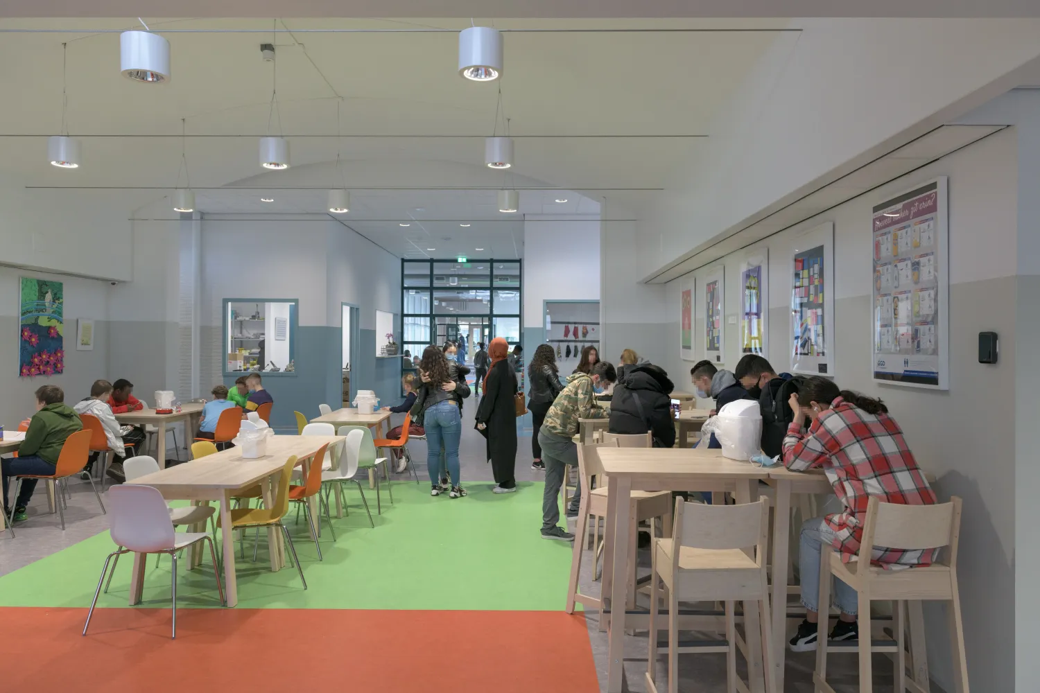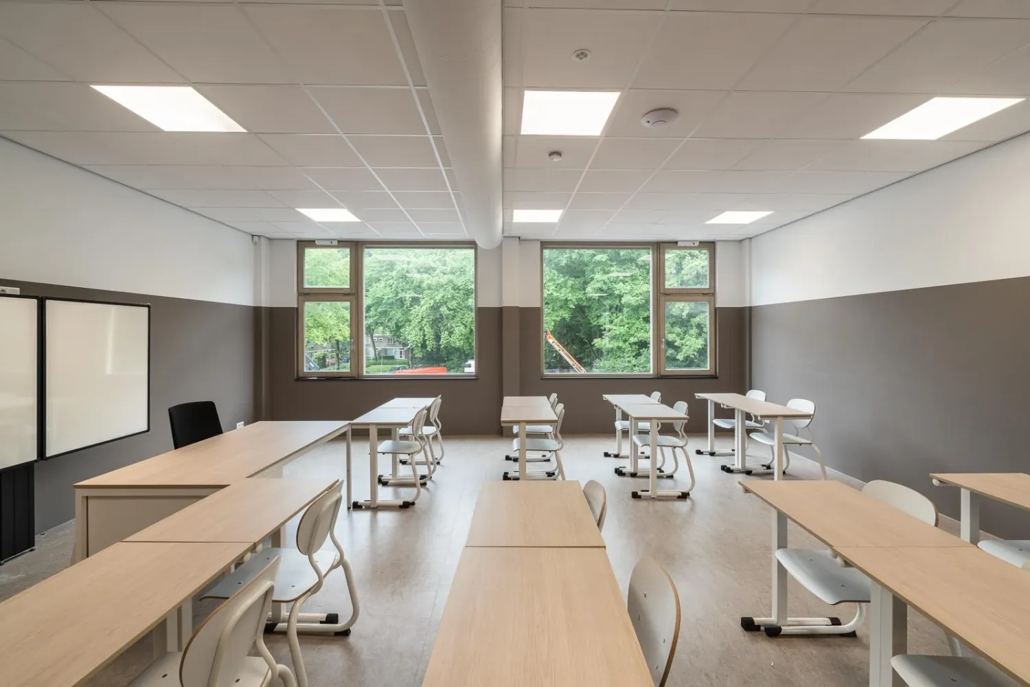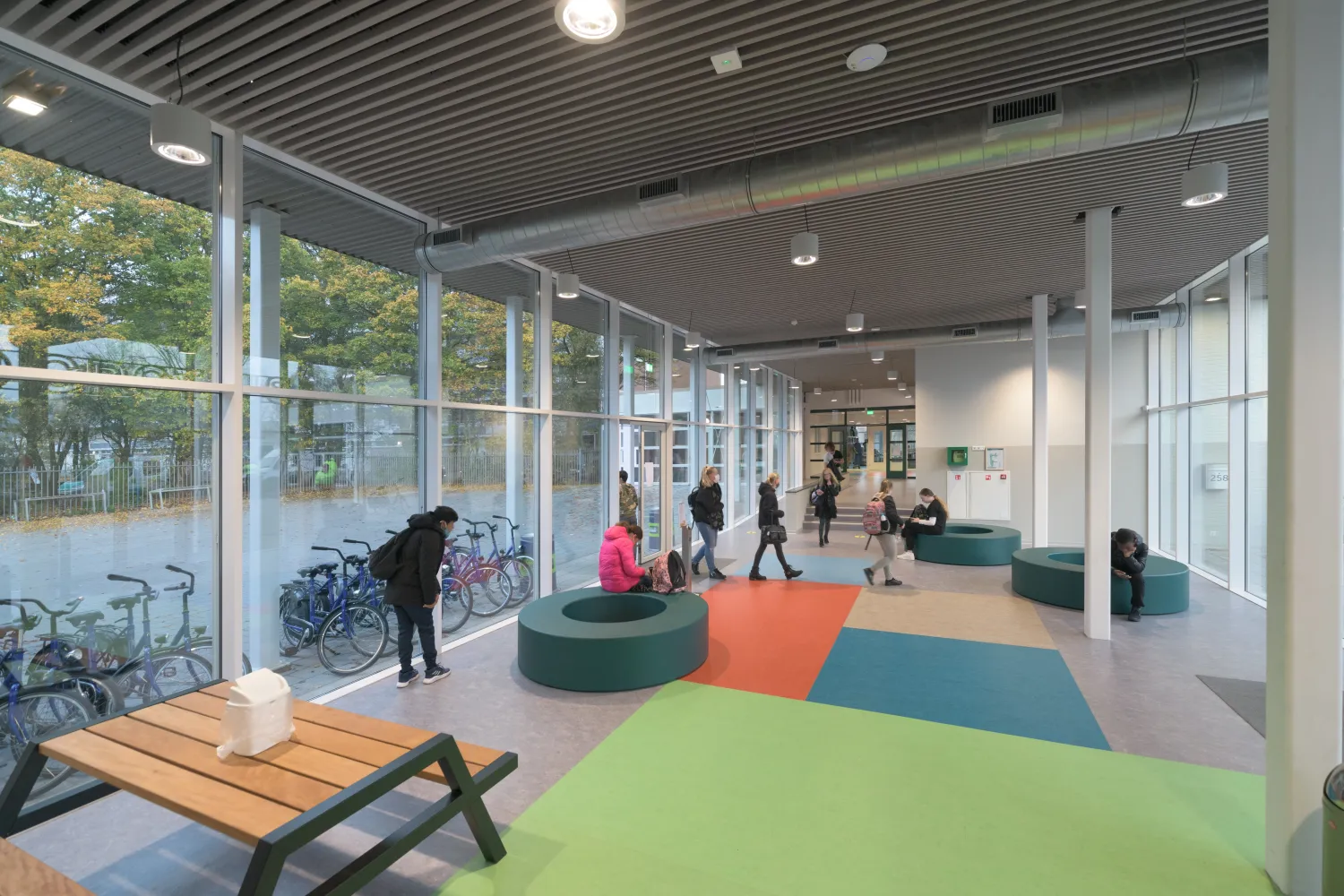 Het interieur is ontworpen met oog voor sfeer, comfort en menselijke schaal. Grote karpetten op de vloer zorgen voor een huiselijke uitstraling, terwijl de openheid en kleurgebruik bijdragen aan een warme leeromgeving. Binnen het beschikbare budget is een plek gecreëerd waar leerlingen zich welkom en veilig voelen—een schoolgebouw dat aanvoelt als een tweede thuis.