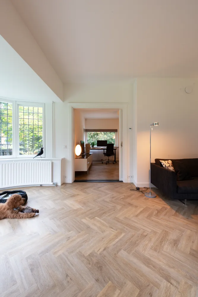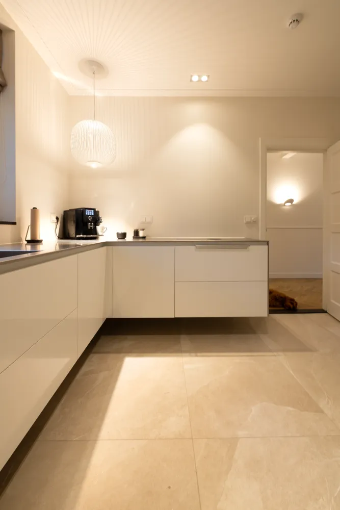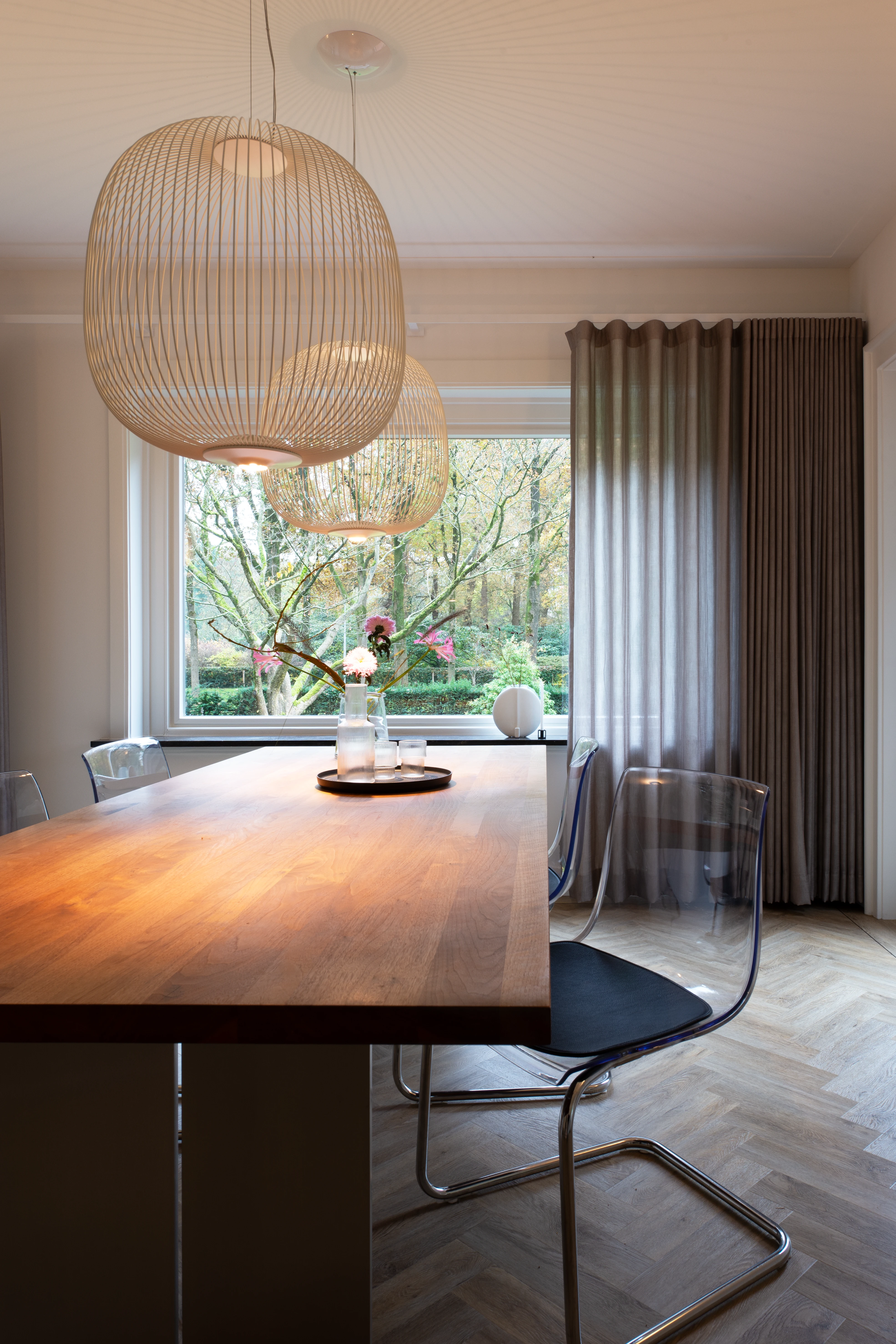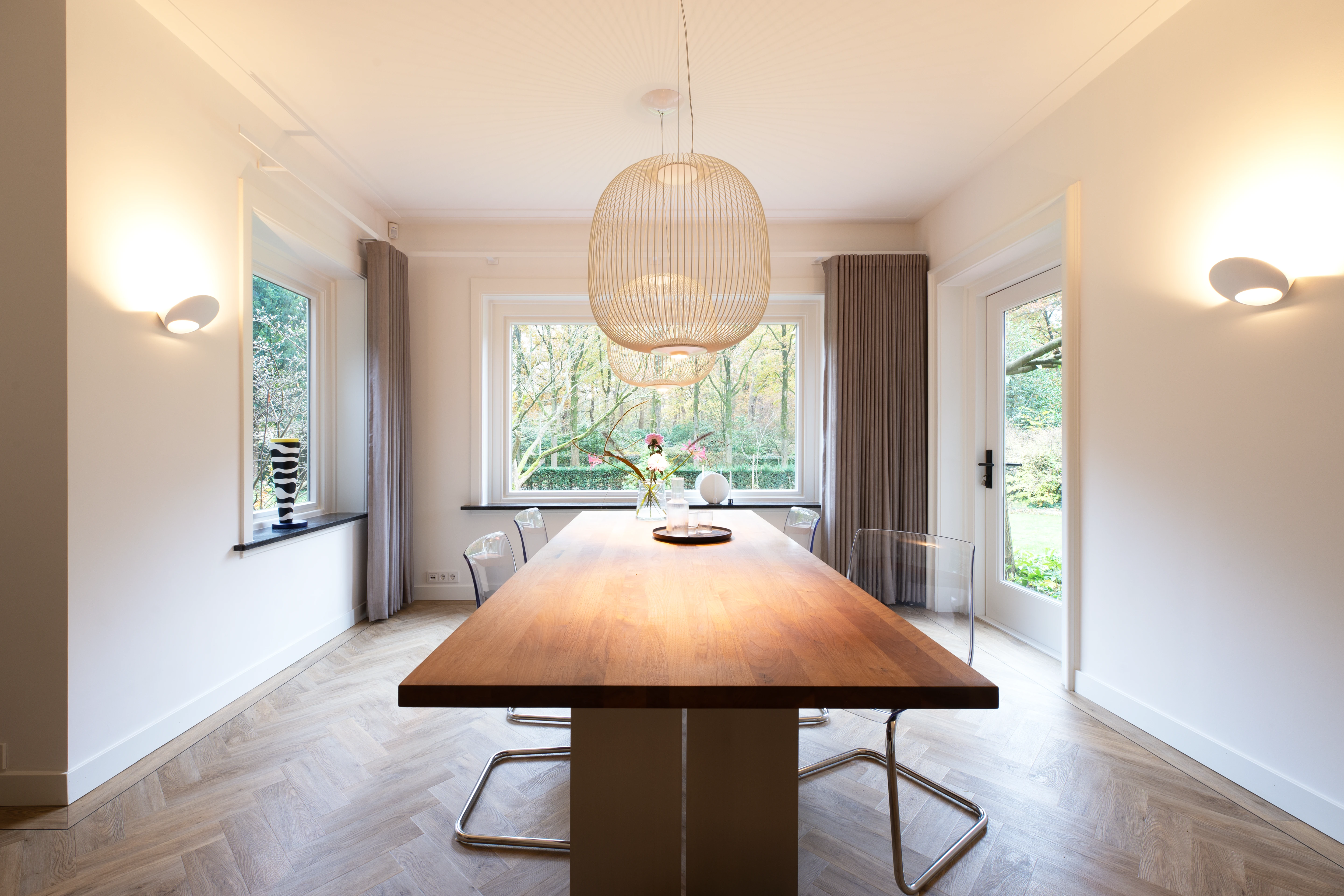 Bij deze renovatie stond steeds de vraag centraal of de details natuurlijk en passend aanvoelden bij het huis. Het resultaat is een harmonieuze leefruimte geworden waar het verleden en heden naadloos samenkomen. Het lichtplan geeft de ruimtes een specifiek, reflecterend karakter, zoals bijvoorbeeld de Spokes-armatuur boven de eettafel. De keuken en badkamers zijn volledig vernieuwd met respect voor het historische karakter van het huis, waardoor de authentieke sfeer behouden blijft.