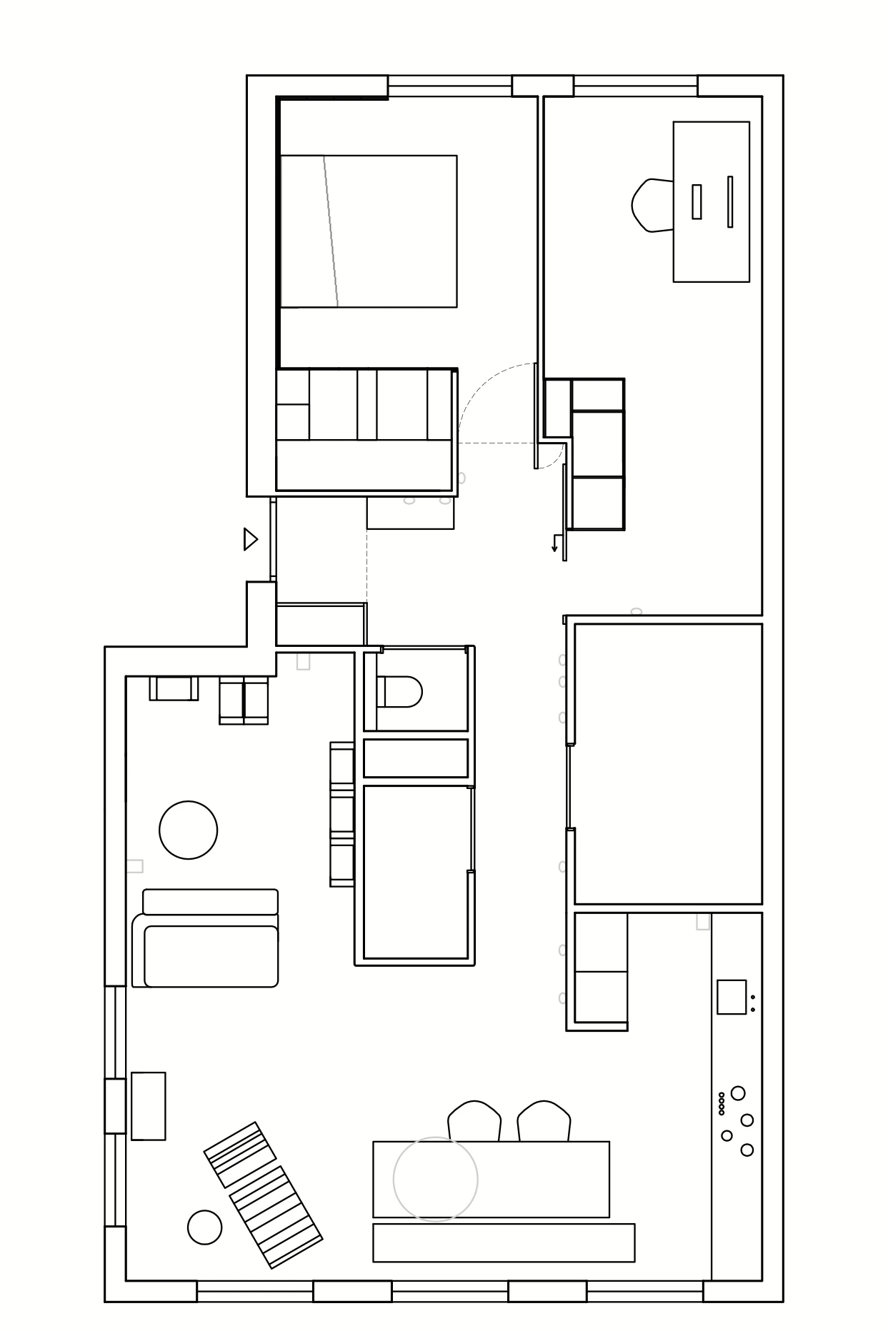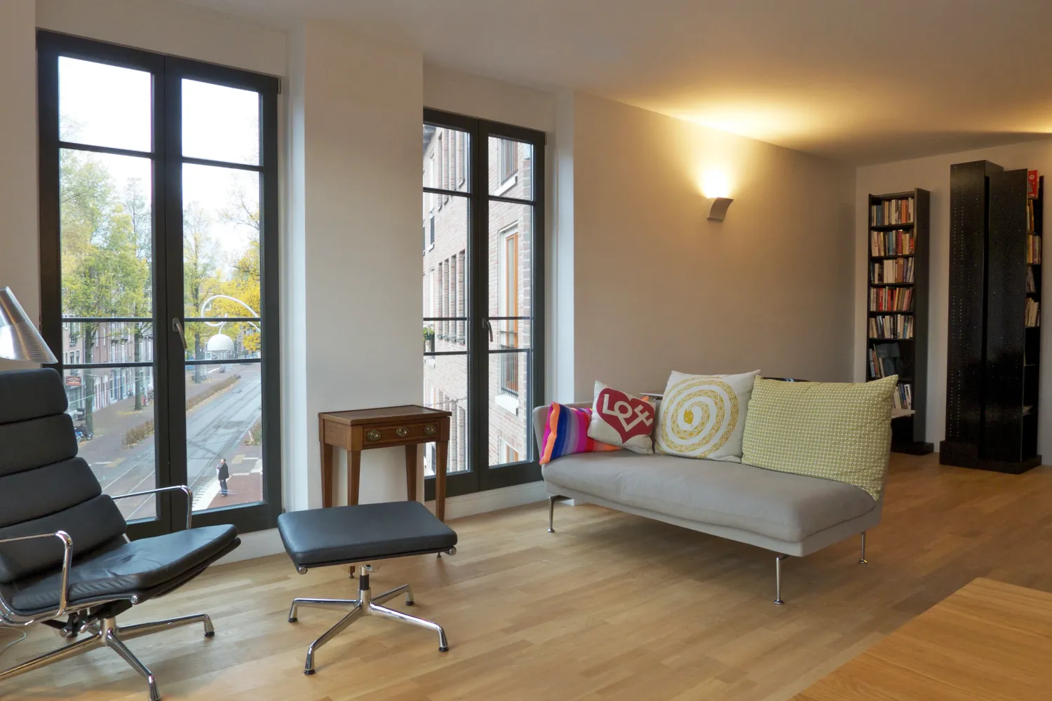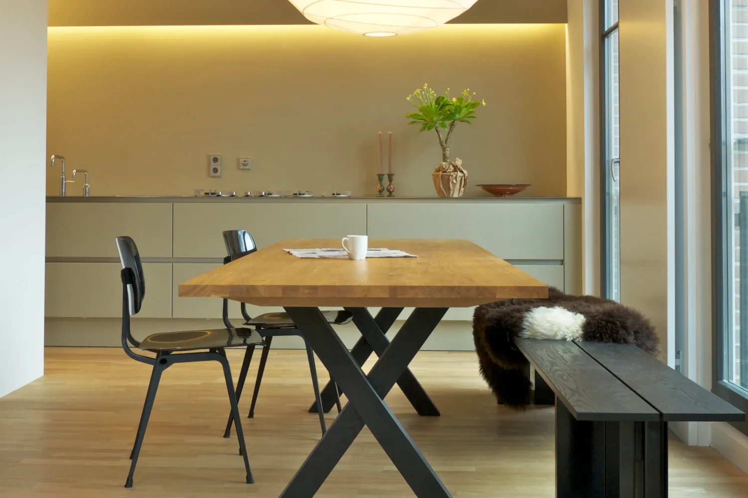AMstudio heeft het nieuwbouwappartement volledig gestript om een licht en compact interieur te creëren. De ruimtes vloeien naadloos in elkaar over, terwijl er ook individuele plekken zijn om te ontspannen. De centrale hal fungeert als het hart van de woning en verbindt het voor- en achterdeel. Een draai- en schuifdeur, geïnspireerd door Rietveld, kan de zichtlijn openen of sluiten. Opvallend is de ruwe, donkere kern van leemstuc die als een solide element fungeert waar alles omheen draait. De keuken fungeert als één groot dressoir waaruit maaltijden worden geserveerd. De tafel met lage bank en de op maat gemaakte boekenkasten zijn een knipoog naar Manhattan, waar de bewoners eerder hebben gewoond. De zorgvuldig gekozen kleuren voegen accenten en sfeer toe aan het interieur. Kortom, deze woning is een harmonieuze samensmelting van twee geliefde werelden, waarin beide bewoners zich op hun eigen manier thuis voelen.