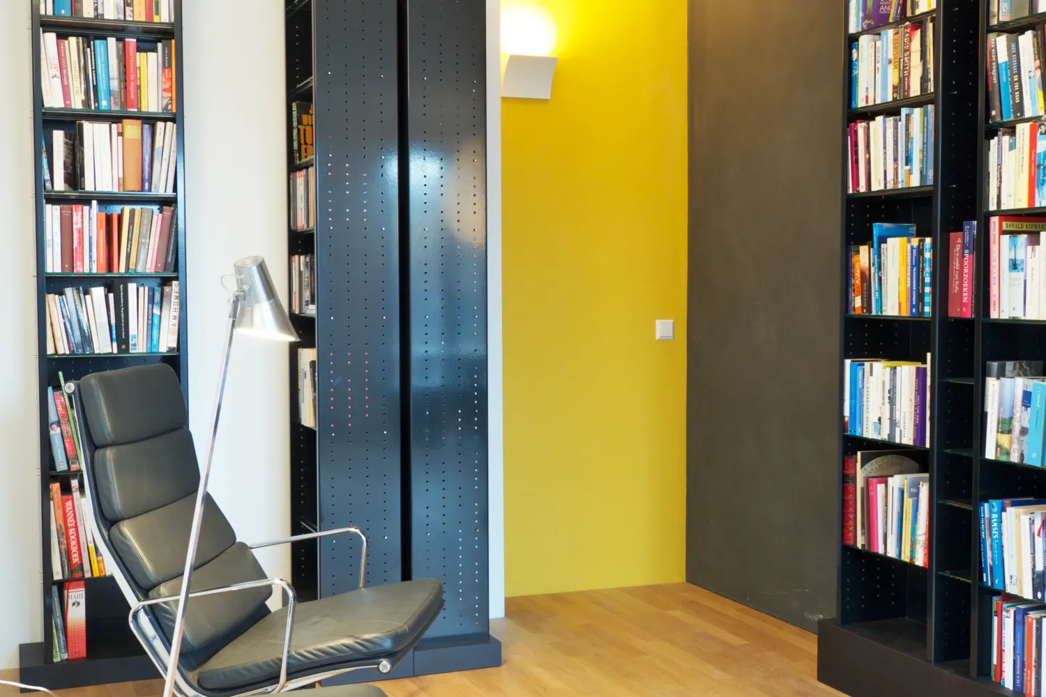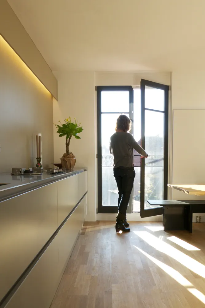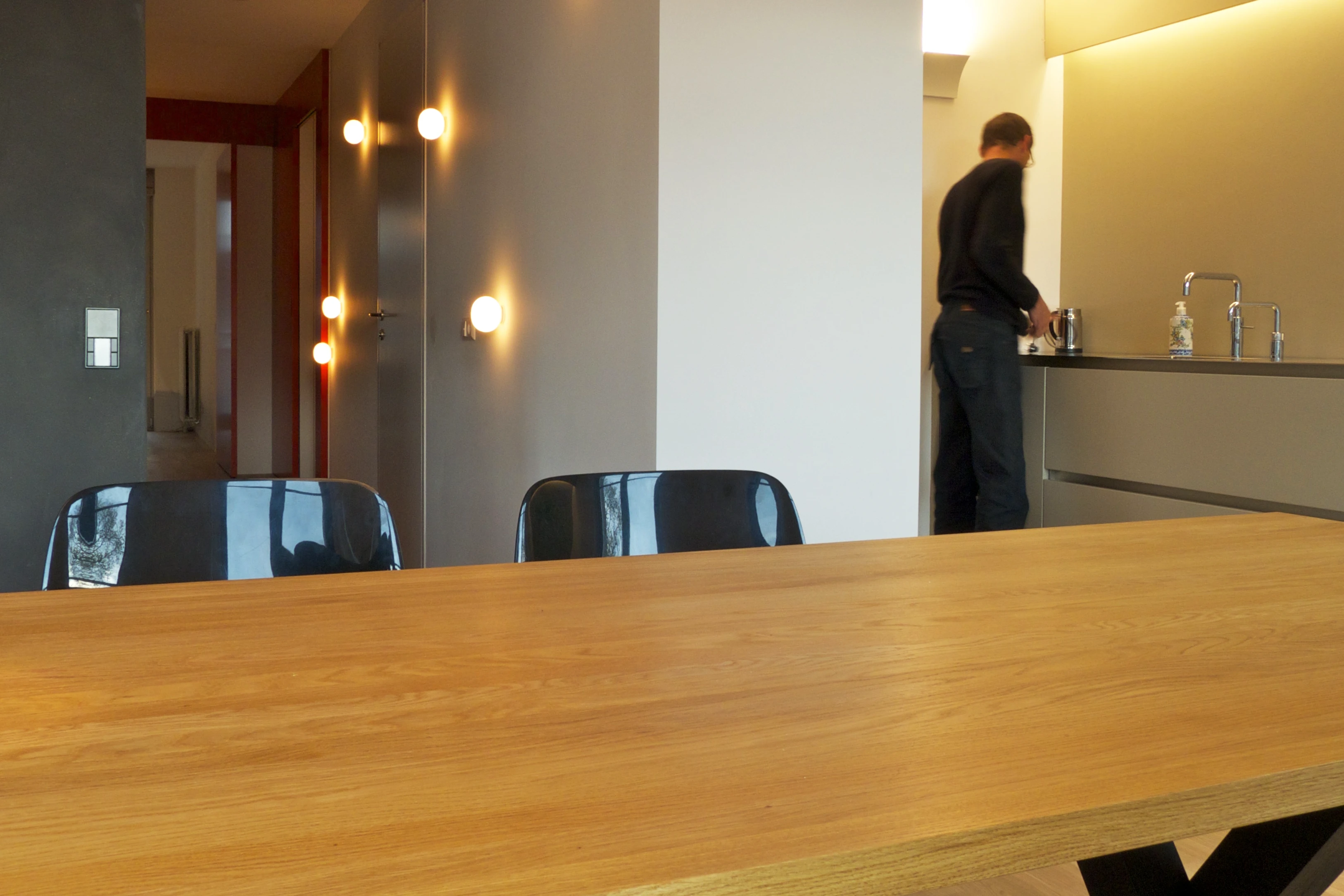 AMstudio heeft het nieuwbouwappartement volledig gestript om een licht en compact interieur te creëren. De ruimtes vloeien naadloos in elkaar over, terwijl er ook individuele plekken zijn om te ontspannen. De centrale hal fungeert als het hart van de woning en verbindt het voor- en achterdeel. Een draai- en schuifdeur, geïnspireerd door Rietveld, kan de zichtlijn openen of sluiten. Opvallend is de ruwe, donkere kern van leemstuc die als een solide element fungeert waar alles omheen draait. De keuken fungeert als één groot dressoir waaruit maaltijden worden geserveerd. De tafel met lage bank en de op maat gemaakte boekenkasten zijn een knipoog naar Manhattan, waar de bewoners eerder hebben gewoond. De zorgvuldig gekozen kleuren voegen accenten en sfeer toe aan het interieur. Kortom, deze woning is een harmonieuze samensmelting van twee geliefde werelden, waarin beide bewoners zich op hun eigen manier thuis voelen.