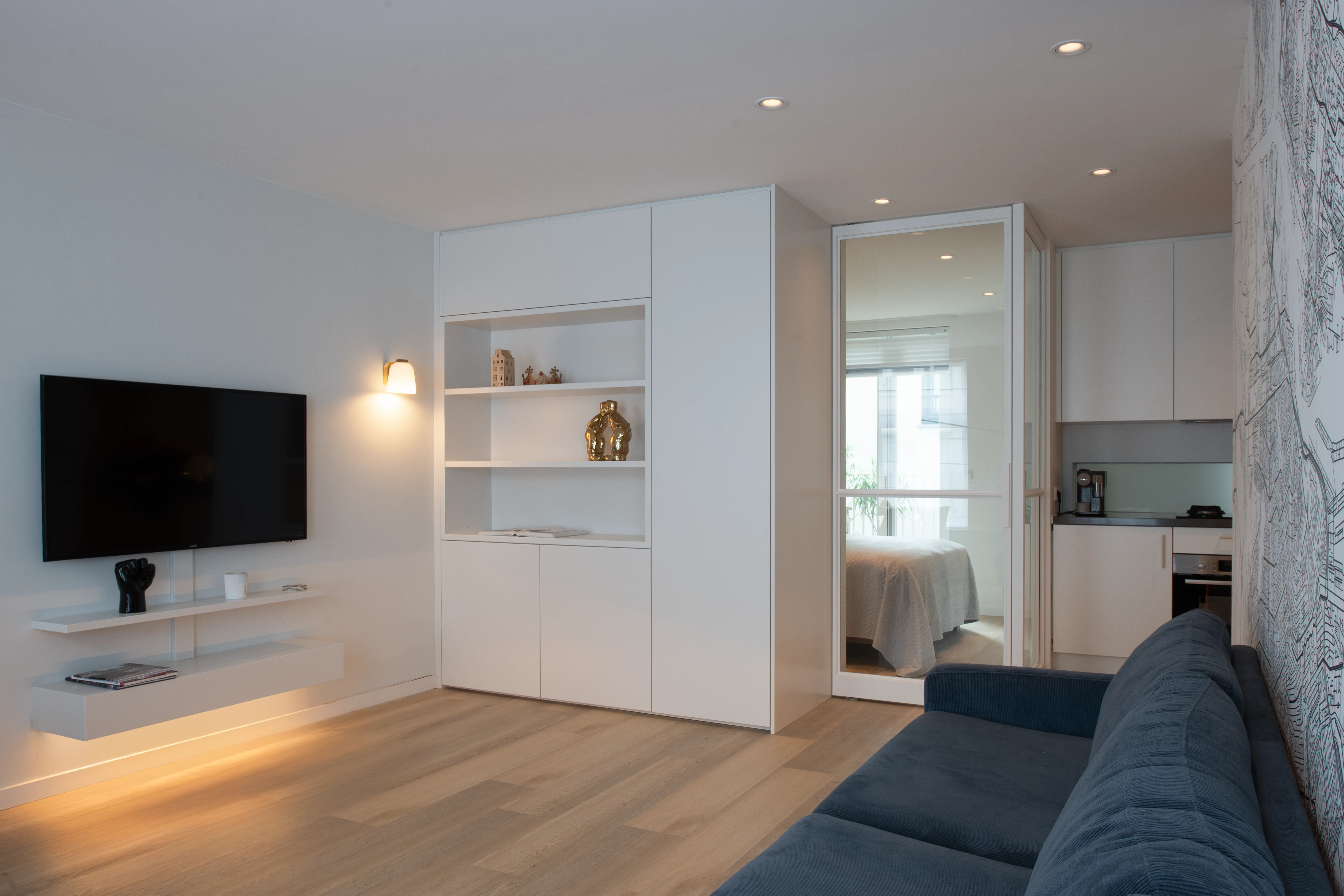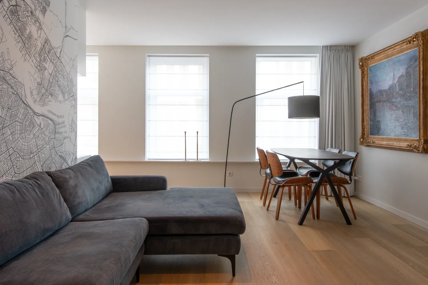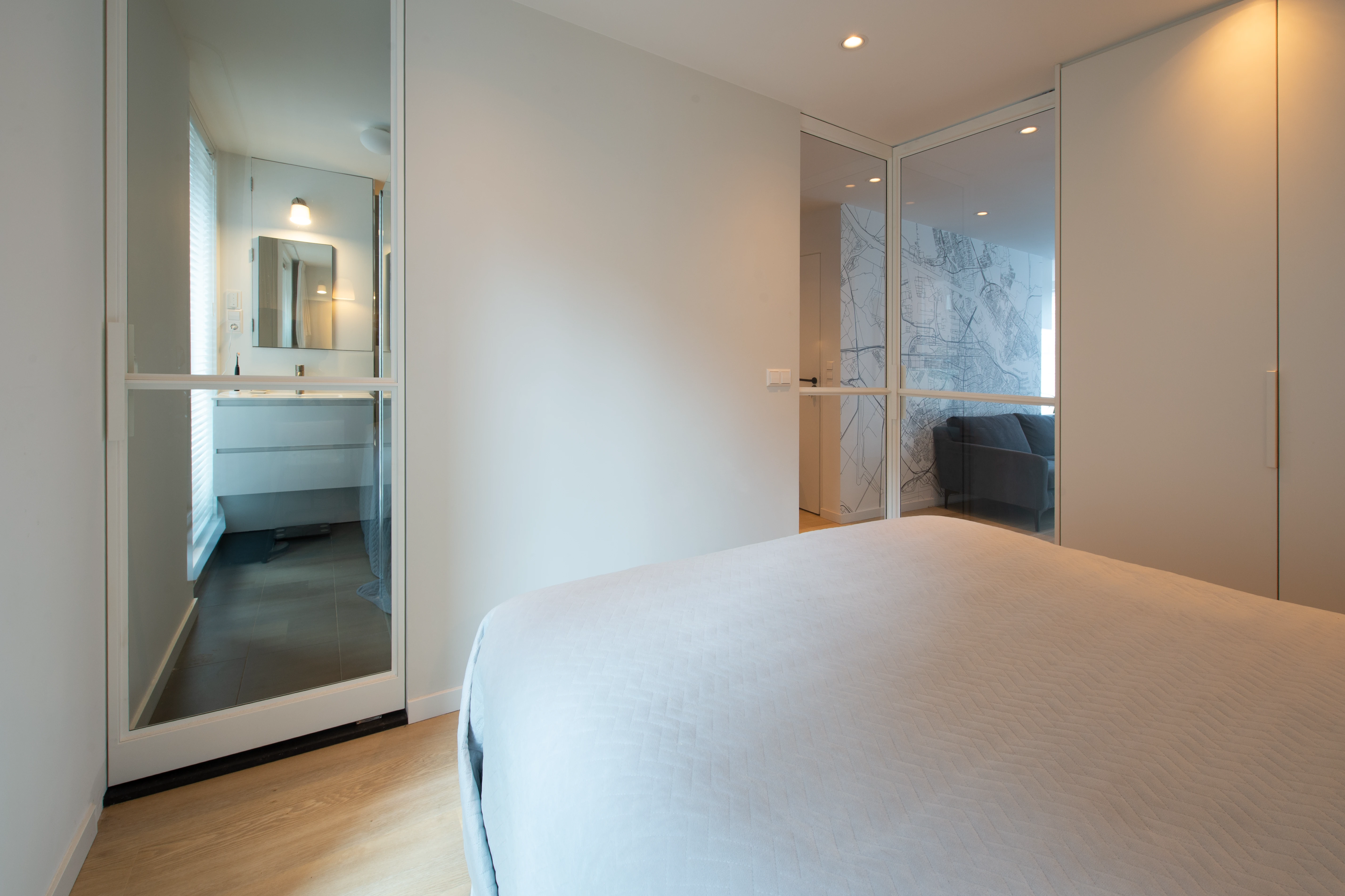 Omdat hij veel reist en een periode in Tokyo heeft gewoond, moest dit huis écht als thuis voelen. Daarom is gekozen voor een Japandi interieurstijl: minimalistisch, warm en rustgevend. De eyecatcher? Een unieke kaart van Amsterdam als behang, die het appartement een persoonlijke en stedelijke touch geeft.