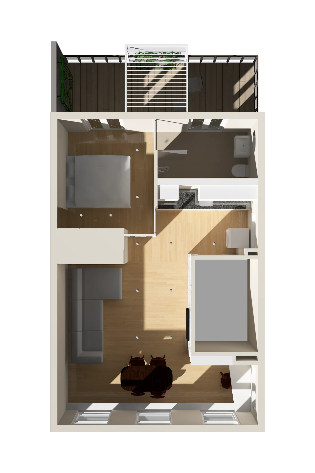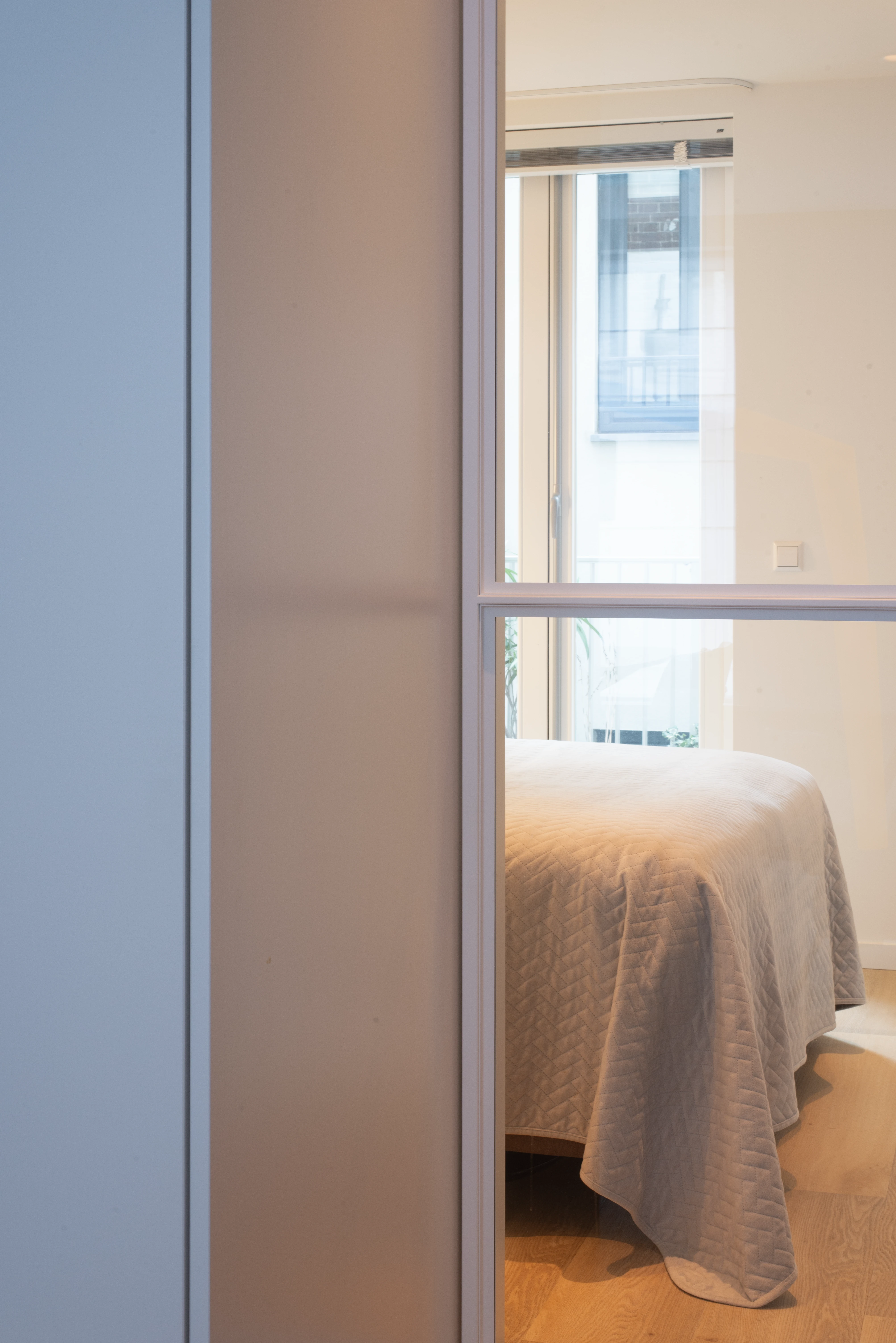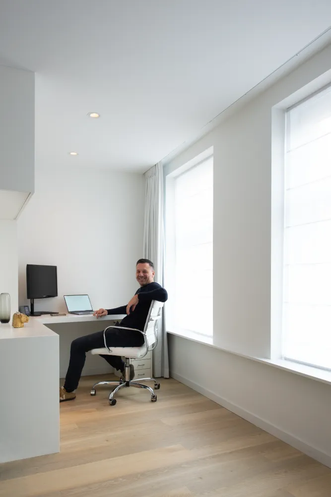 Daarnaast is er een intieme werkplek gecreëerd door functies te groeperen en optimaal gebruik te maken van de ruimte. Een plek waar je je volledig kunt focussen tijdens het thuiswerken, terwijl je toch de sfeer van het hele appartement ervaart.