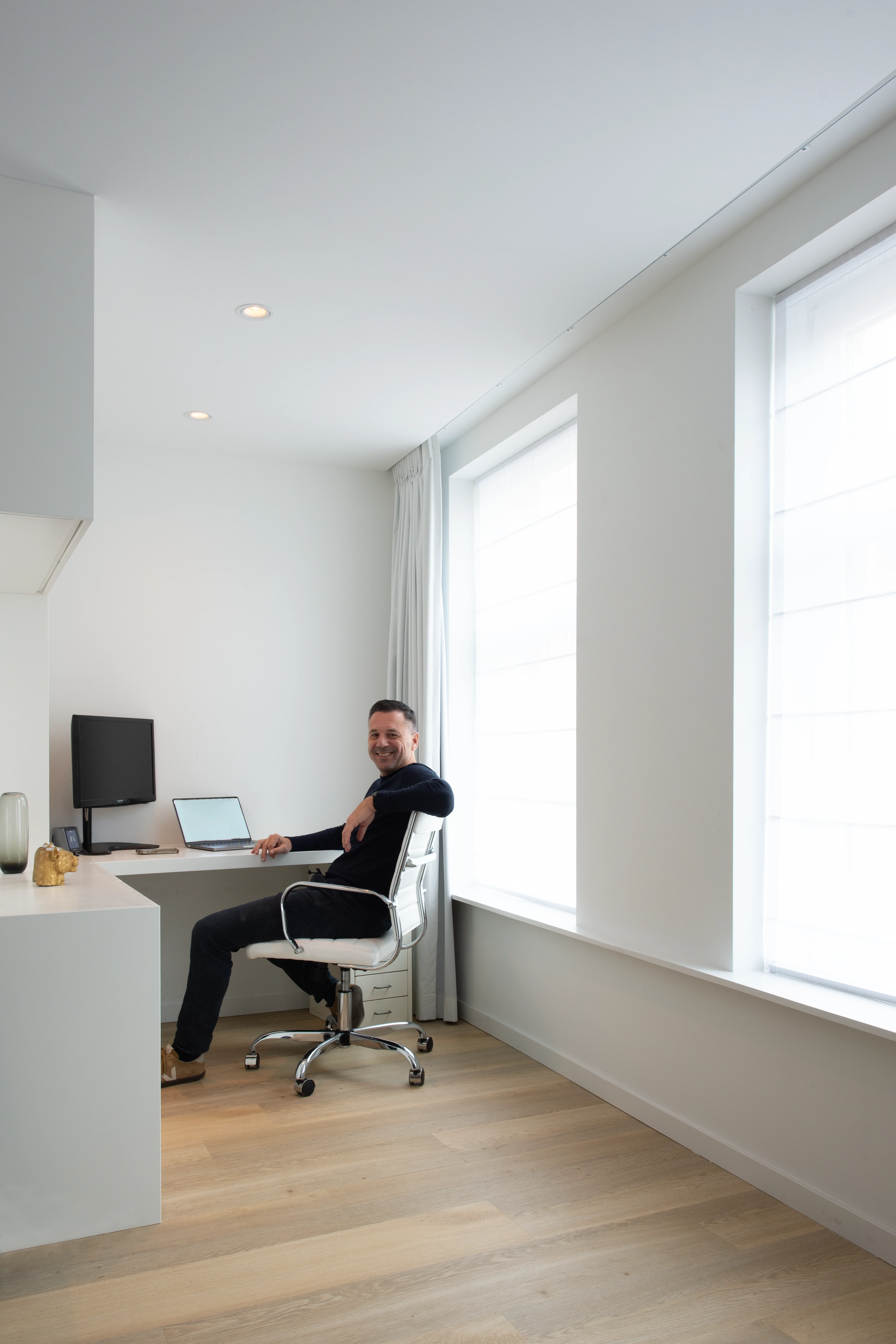 Ik had de sterke behoefte om mijn appartement in Amsterdam na 20 jaar compleet te restylen en te verbouwen naar een omgeving die beter aansluit bij mijn huidige leven en carrière. Een plek waar het fijn wonen, werken en ontspannen is, en waarin optimaal gebruik wordt gemaakt van de beschikbare ruimte. Qua stijl en lichtinval zocht ik naar een sfeer die subtiel refereert aan mijn tijd in Japan, gecombineerd met een duidelijke link naar Amsterdam en aandacht voor duurzaamheid.