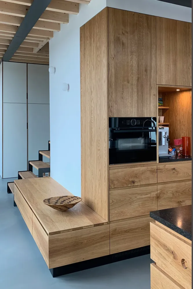 De bewoners van dit zelfbouw-casco-appartement in Amsterdam-Noord waren bij de aankoop enorm enthousiast over het uitzicht, zowel op het IJ als richting Noord. AMstudio maakte het ontwerp voor dit zelfbouw appartement op de 7e verdieping en begeleidde de nieuwe bewoners gedurende het hele proces tot aan de realisatie van het interieur. De woonwens was een stoere, lichte loft ruimte met fijne plekken om bijvoorbeeld te genieten van een kopje koffie of thee tijdens de opkomende zon. De vaste houten bank is zo’n specifieke plek in het interieur. Het gebruik van natuurlijke materialen zoals eiken, de speciaal ontworpen keuken, stalen puien en trap, de verlichting en het verrassende kleurgebruik, geeft deze stoere woning iets intiems en persoonlijks.