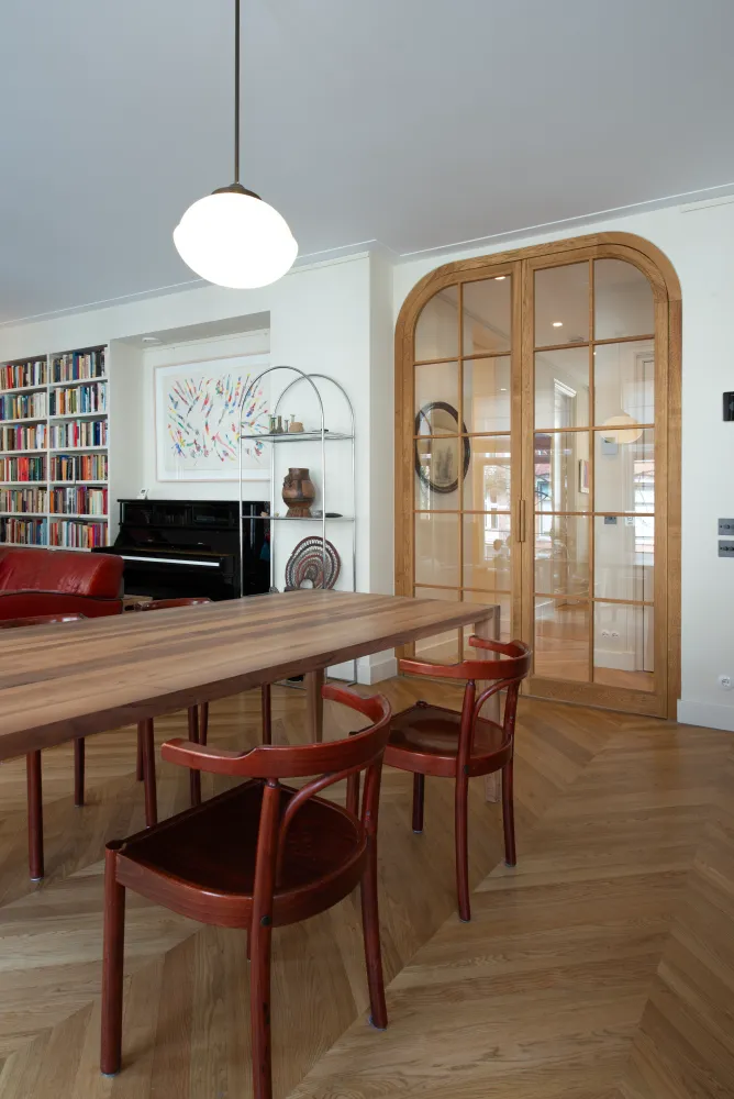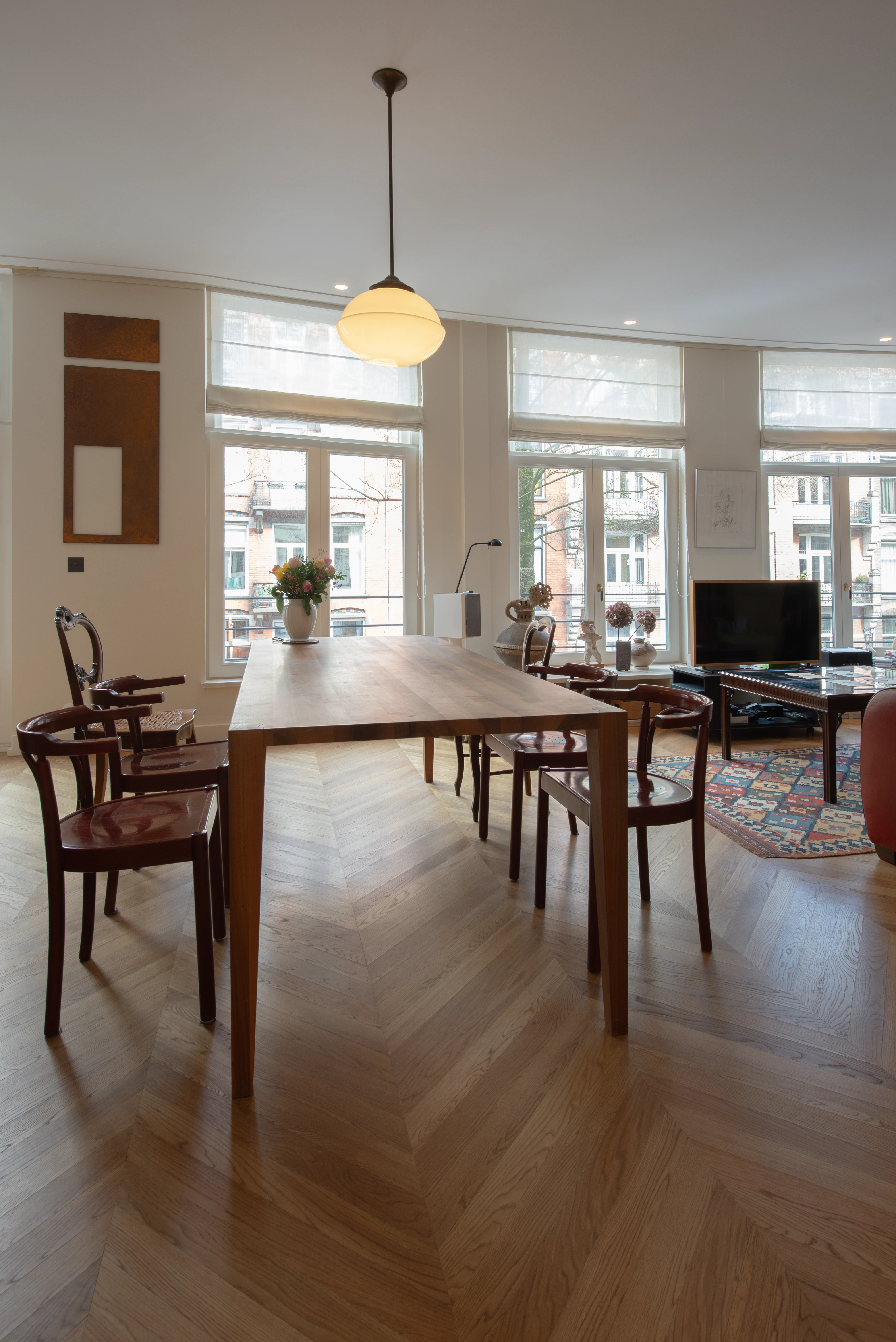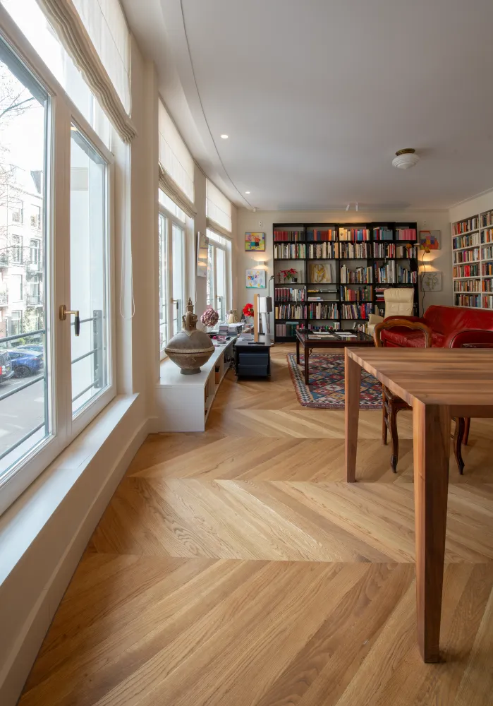 Dit high-end appartement uit 1910 is door een projectontwikkelaar bouwkundig gerenoveerd, met een interieurontwerp dat volledig is afgestemd op de bijzondere breedte van de woning in hartje Zuid. De nieuwe bewoners zijn zeer gehecht aan hun collectie boeken en kunst, die zij in de afgelopen 60 jaar hebben verzameld en waarmee zij hun vorige herenhuis volledig hadden ingericht. Hun belangrijkste wens was dan ook om zich direct weer thuis te voelen in hun nieuwe appartement, omringd door hun dierbare spullen.