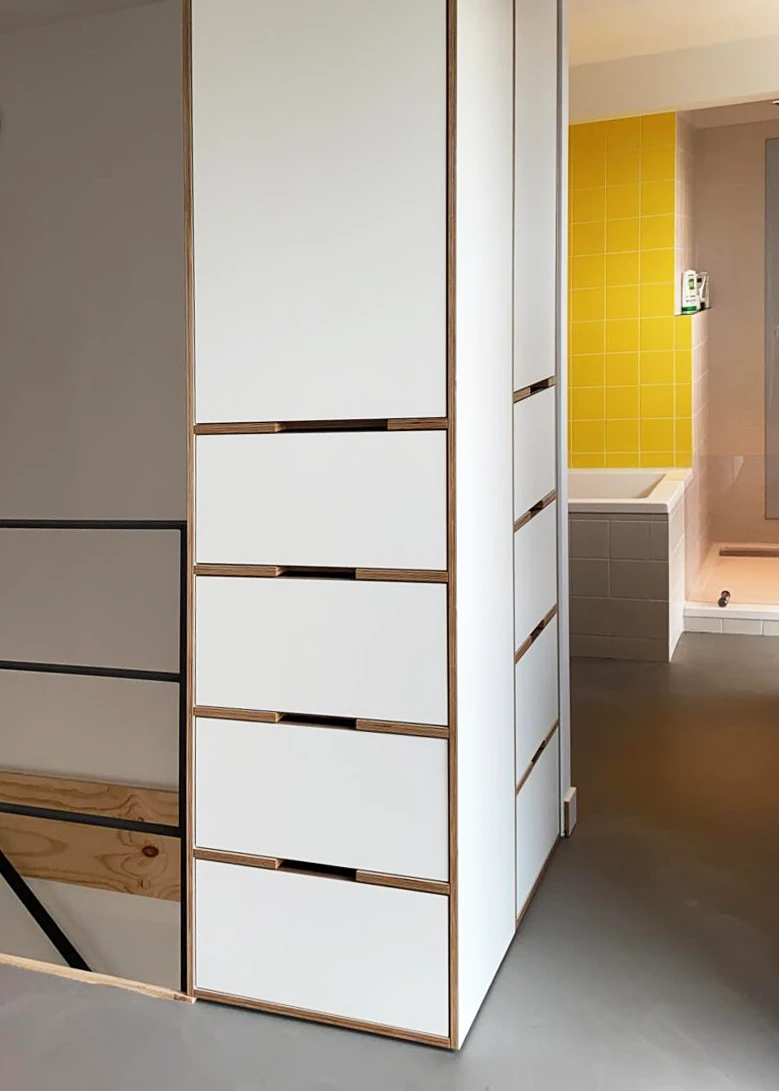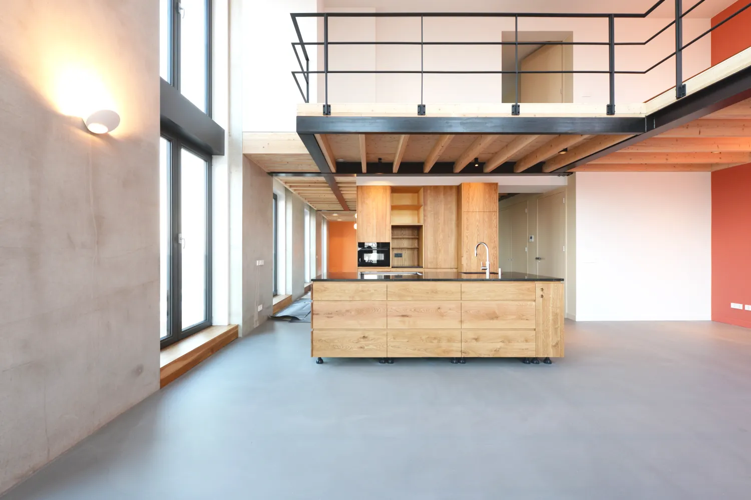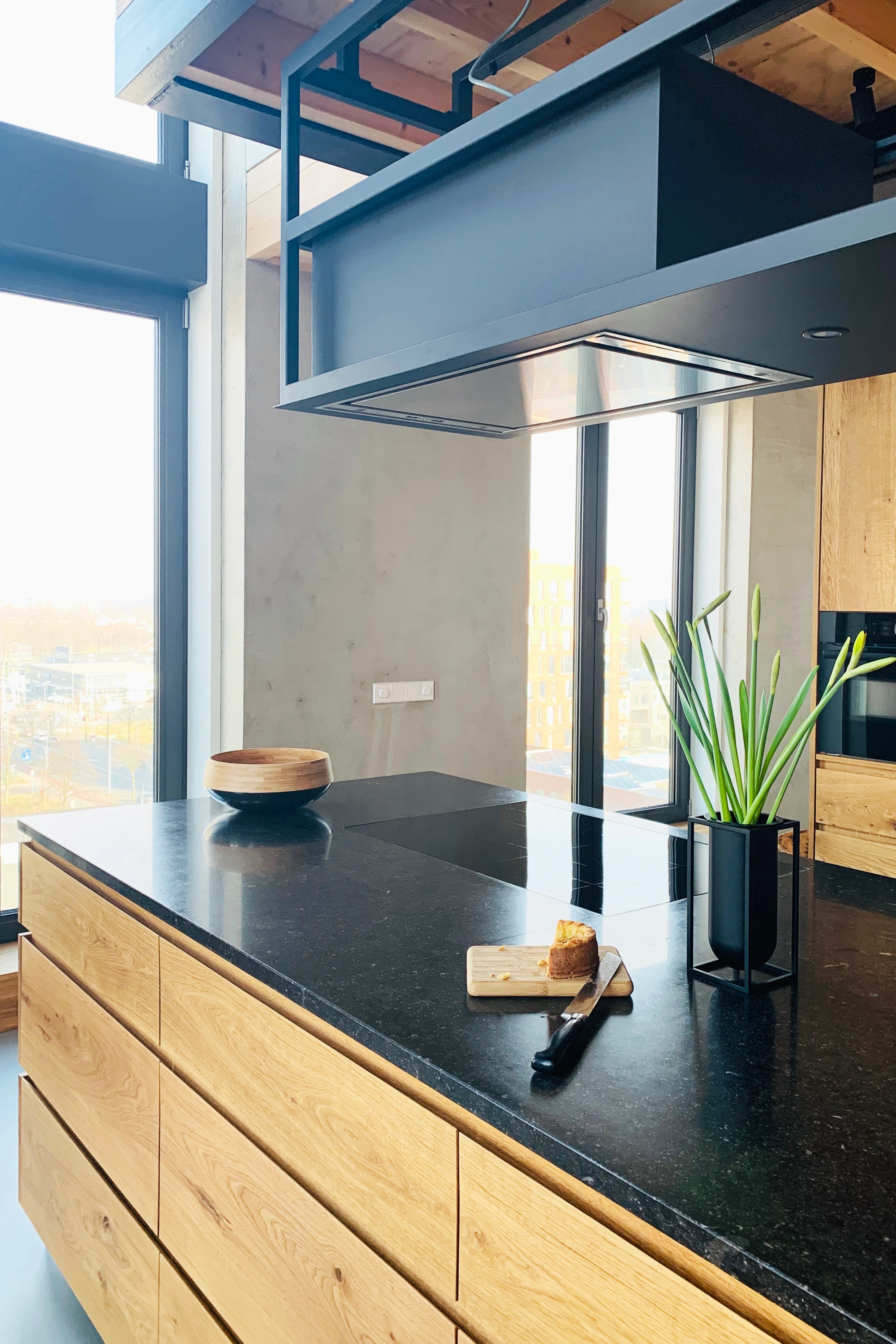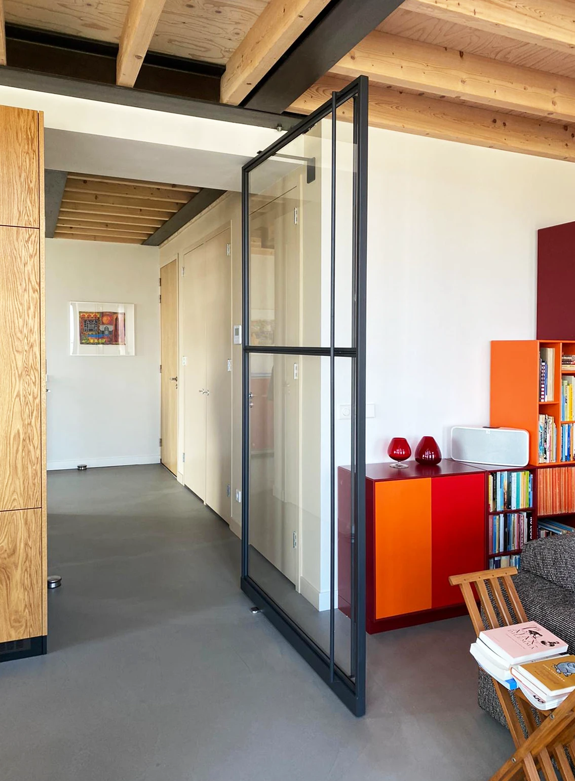 De bewoners van dit zelfbouw-casco-appartement in Amsterdam-Noord waren bij de aankoop enorm enthousiast over het uitzicht, zowel op het IJ als richting Noord. AMstudio maakte het ontwerp voor dit zelfbouw appartement op de 7e verdieping en begeleidde de nieuwe bewoners gedurende het hele proces tot aan de realisatie van het interieur. De woonwens was een stoere, lichte loft ruimte met fijne plekken om bijvoorbeeld te genieten van een kopje koffie of thee tijdens de opkomende zon. De vaste houten bank is zo’n specifieke plek in het interieur. Het gebruik van natuurlijke materialen zoals eiken, de speciaal ontworpen keuken, stalen puien en trap, de verlichting en het verrassende kleurgebruik, geeft deze stoere woning iets intiems en persoonlijks.