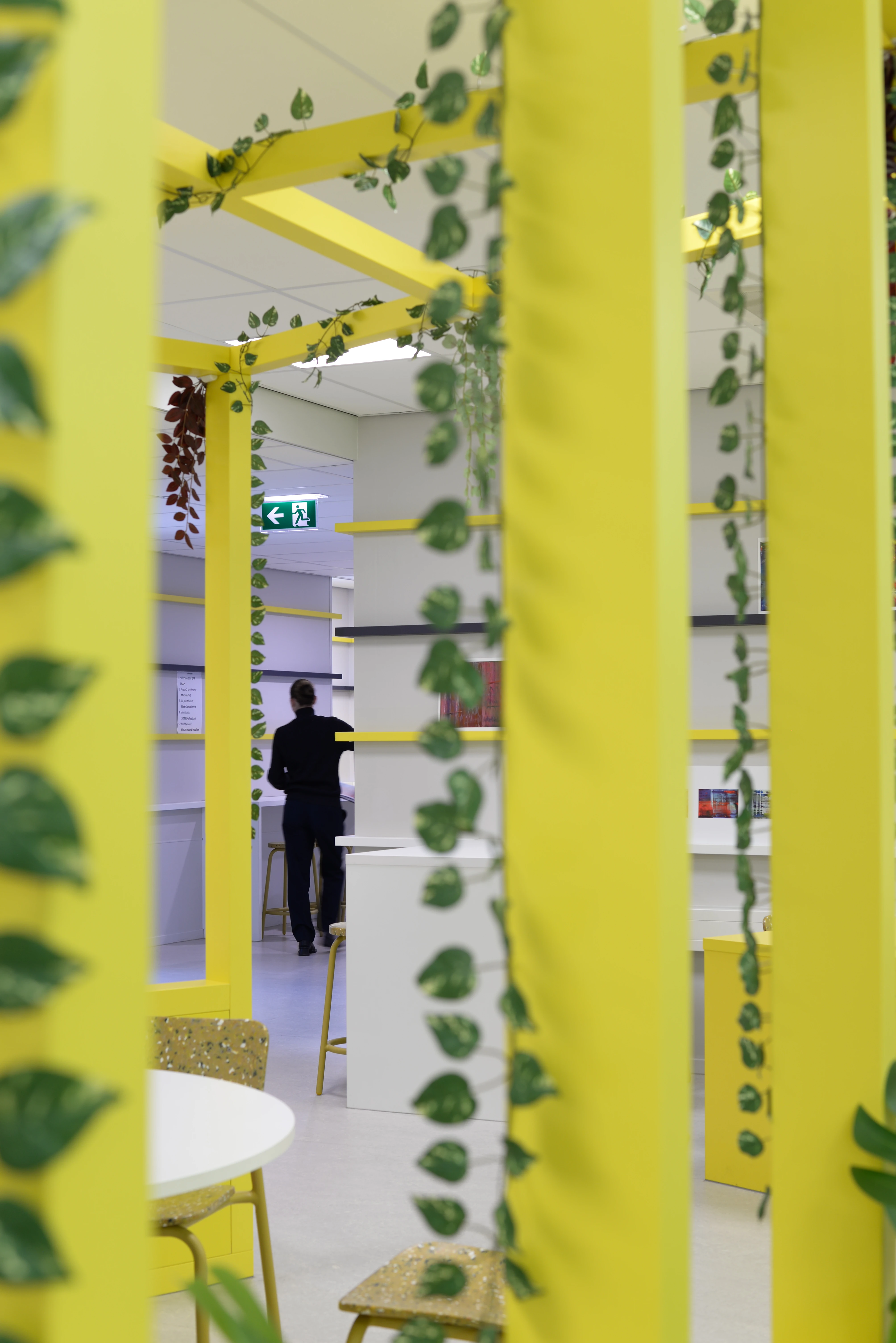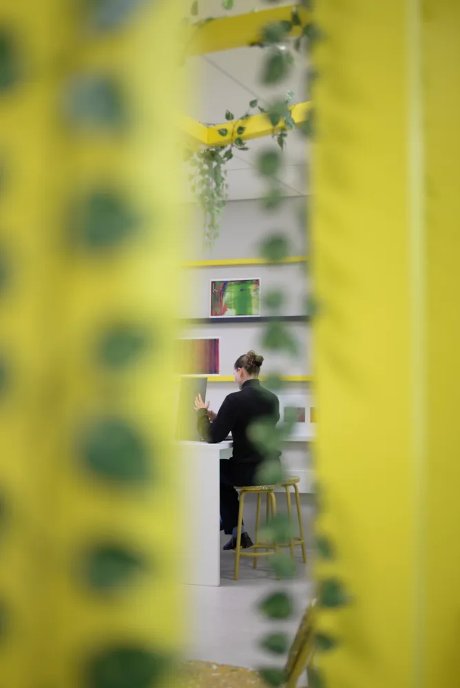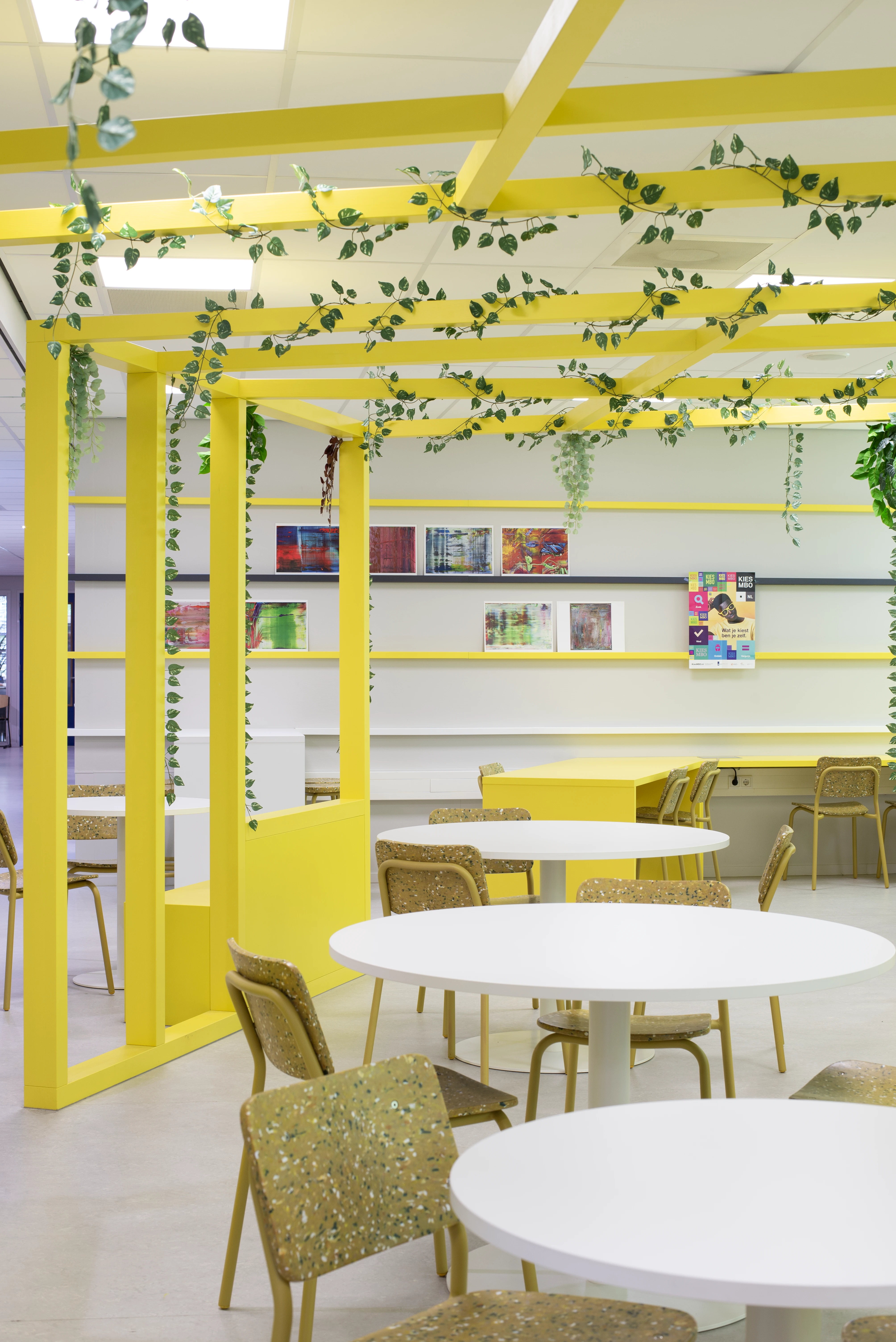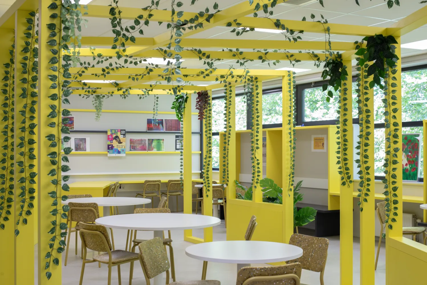 Leerlingen willen een ruimte die bij hen past. Daarom creëren we een vrijstaand houten frame voor geborgenheid, aangevuld met gekleurde ribben aan de muur. Hier kunnen leerlingen hun eigen werk presenteren, waardoor een levendige, kleurrijke en inspirerende leeromgeving ontstaat.