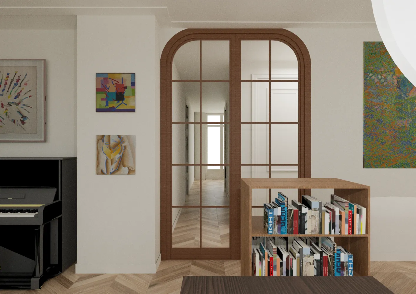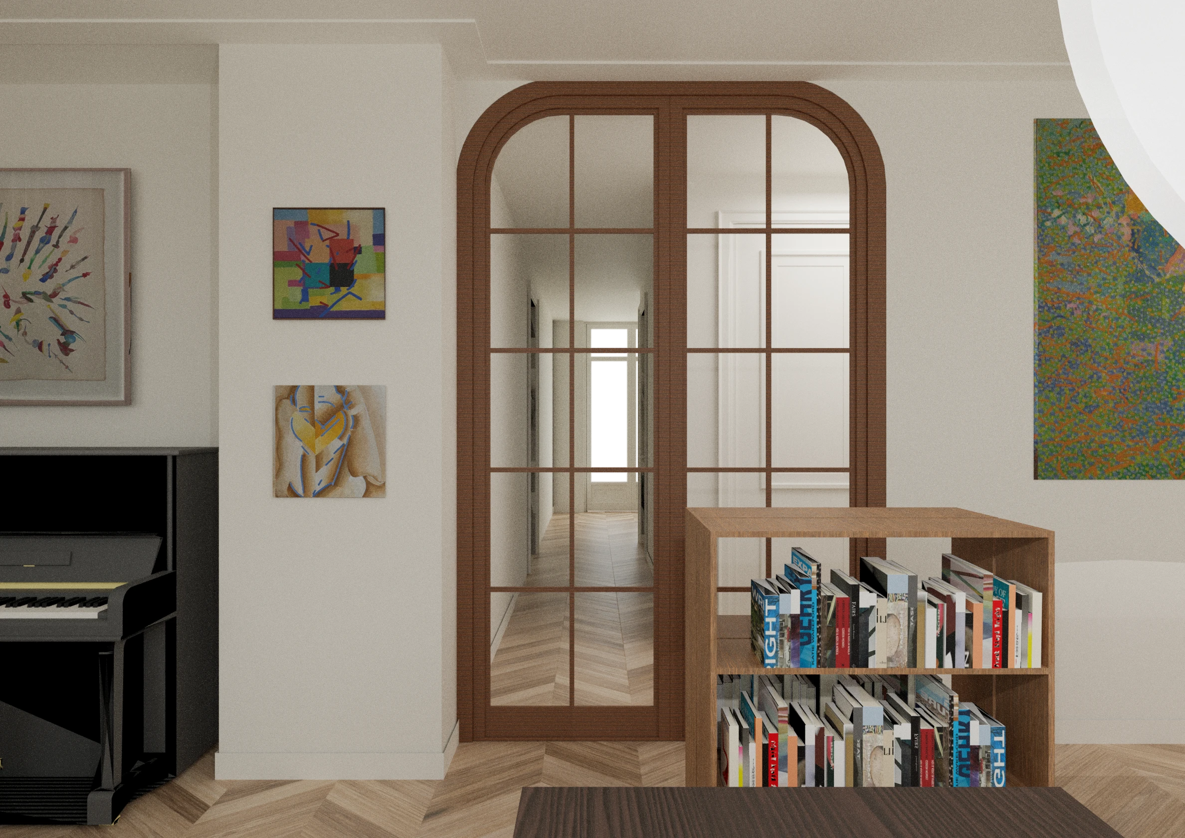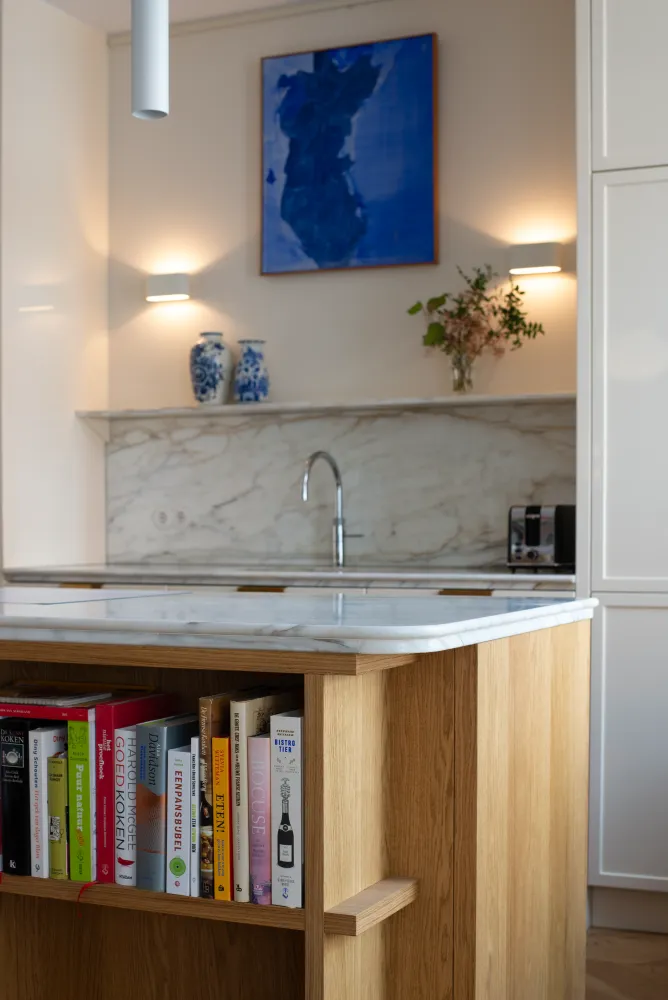 Dit high-end appartement uit 1910 is door een projectontwikkelaar bouwkundig gerenoveerd, met een interieurontwerp dat volledig is afgestemd op de bijzondere breedte van de woning in hartje Zuid. De nieuwe bewoners zijn zeer gehecht aan hun collectie boeken en kunst, die zij in de afgelopen 60 jaar hebben verzameld en waarmee zij hun vorige herenhuis volledig hadden ingericht. Hun belangrijkste wens was dan ook om zich direct weer thuis te voelen in hun nieuwe appartement, omringd door hun dierbare spullen.