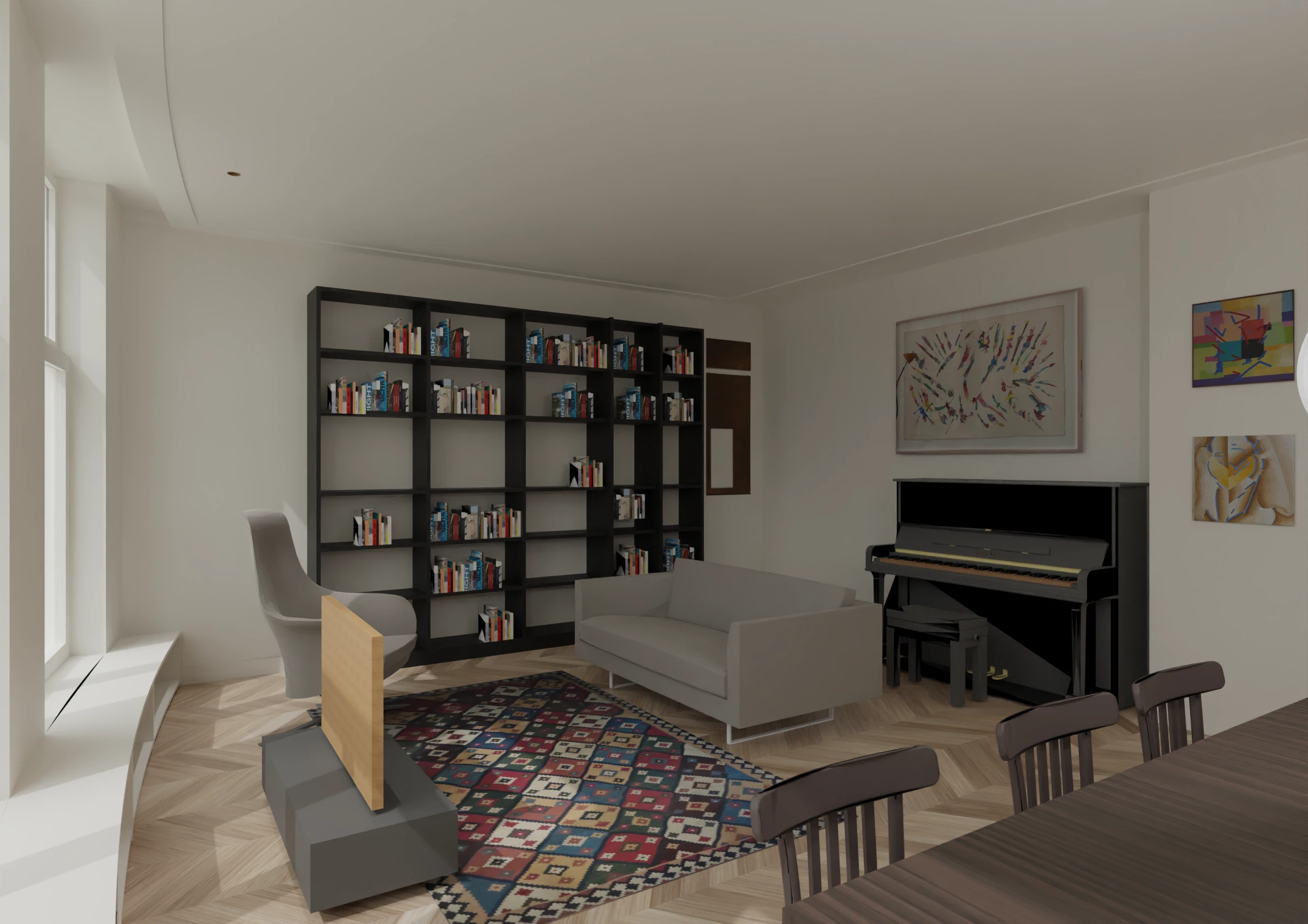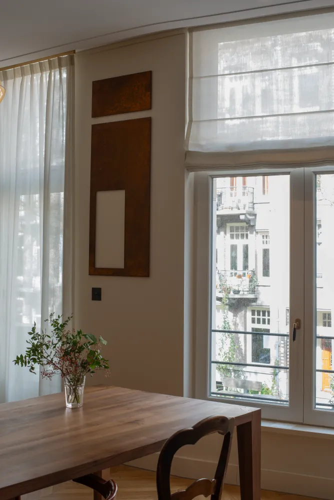 Deze uitdaging is met succes gerealiseerd: dankzij een uitgebalanceerde combinatie van op maat gemaakte meubels, zoals de vensterbank, zorgvuldig gekozen posities van de kunstwerken en hoogwaardige stoffen voor stijlvolle raambekleding, is een harmonieuze en persoonlijke woonruimte gecreëerd. Kortom, totale ontzorging.