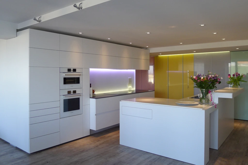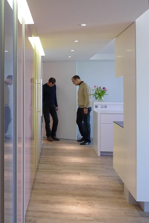 De twee appartementen aan de Amstel zijn samengevoegd en volledig ontworpen en verbouwd door AMstudio om optimaal gebruik te maken van het adembenemende uitzicht. Tegelijkertijd fungeert de woning als een spiegel, waarbij de verschillende ruimtes naadloos in elkaar overvloeien en een ruimtelijk gevoel creëren. De glazen kleurenwand weerspiegelt het panorama van buiten. De op maat gemaakte keuken en kasten zijn speciaal ontworpen en gerealiseerd door AMstudio. De diversiteit in het interieur gebruik wordt als zeer aangenaam ervaren door de bewoners