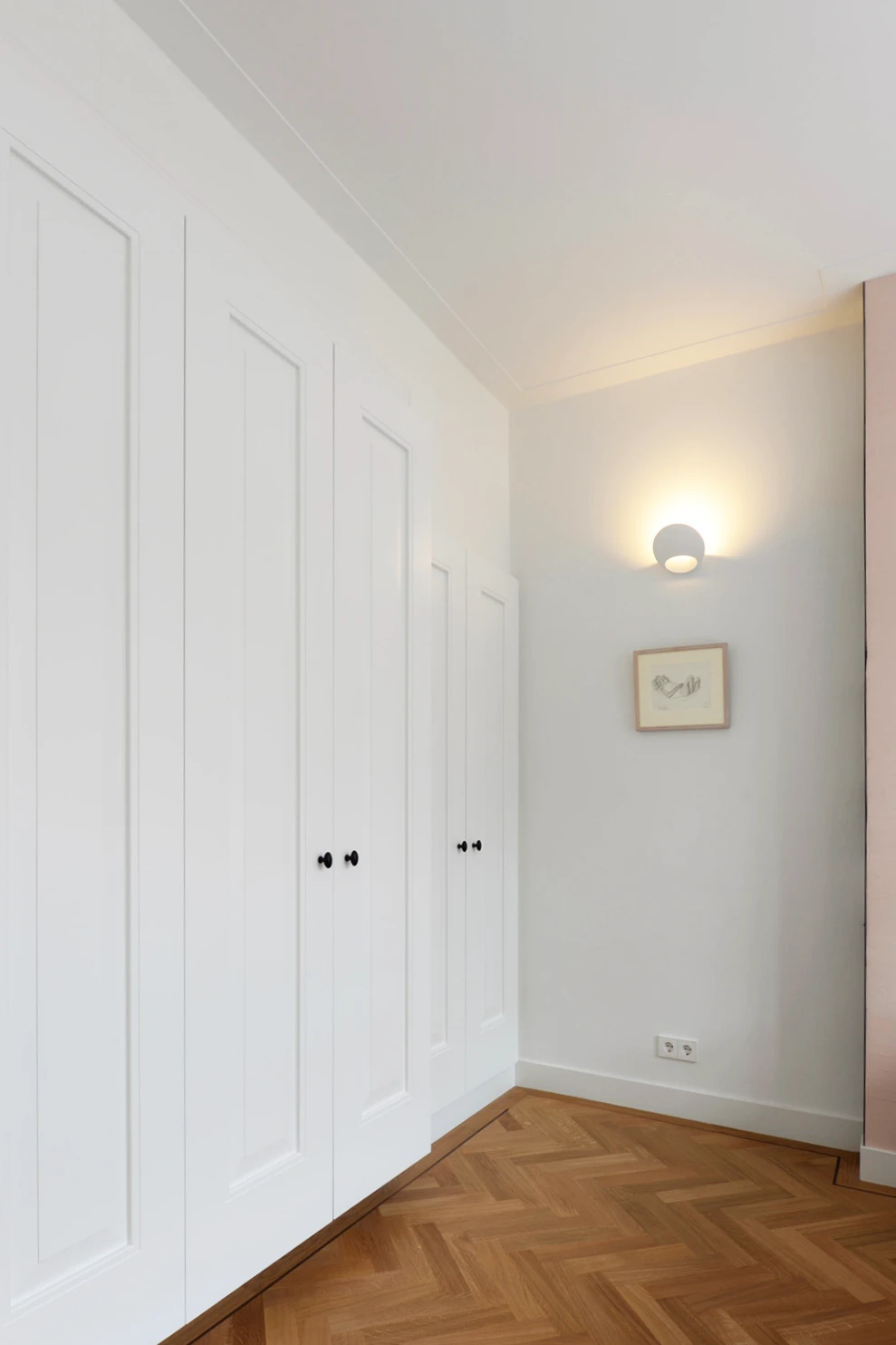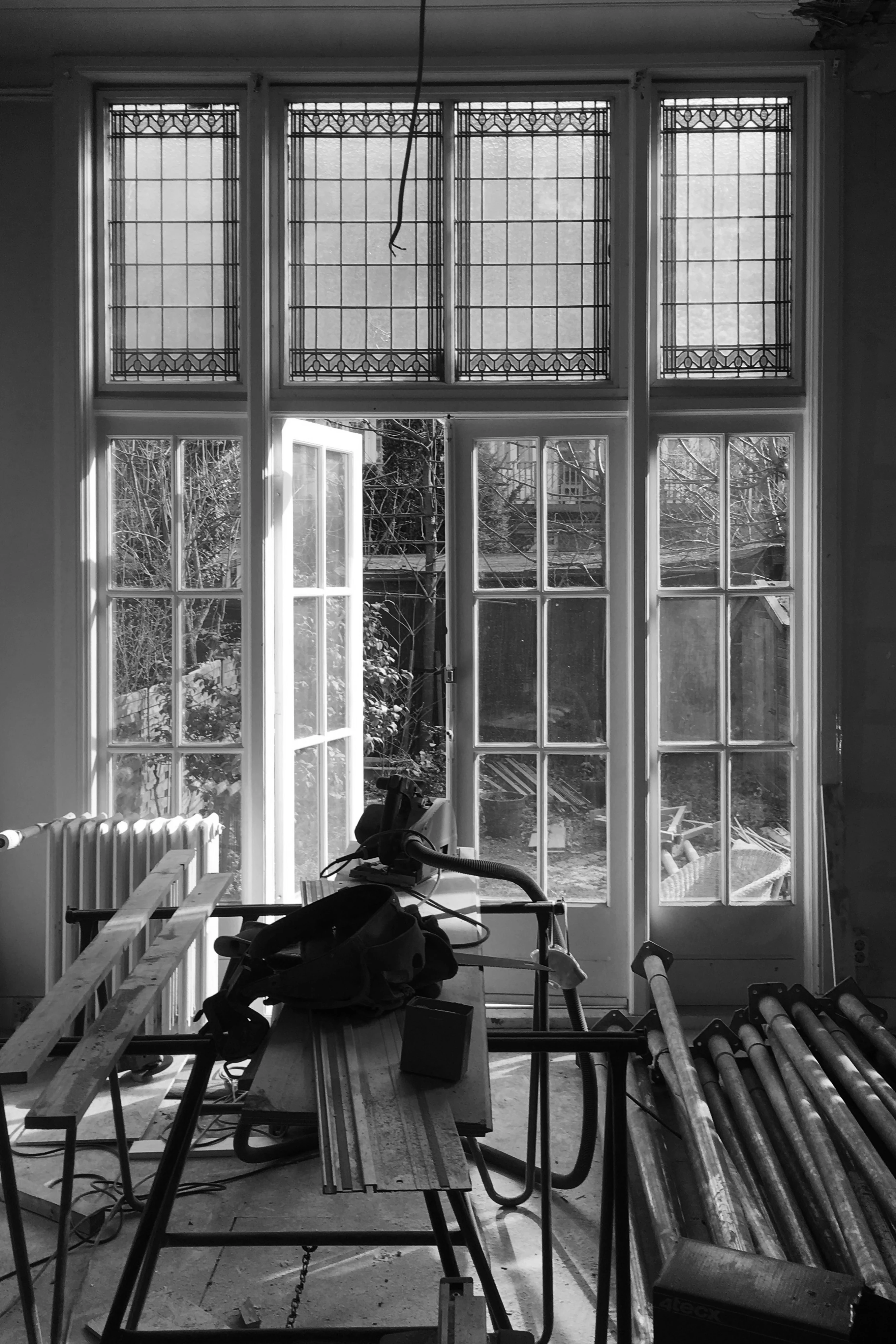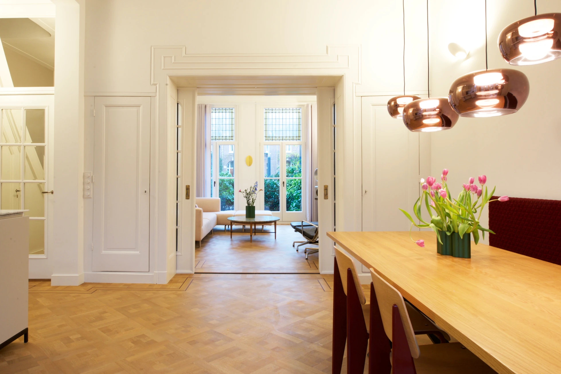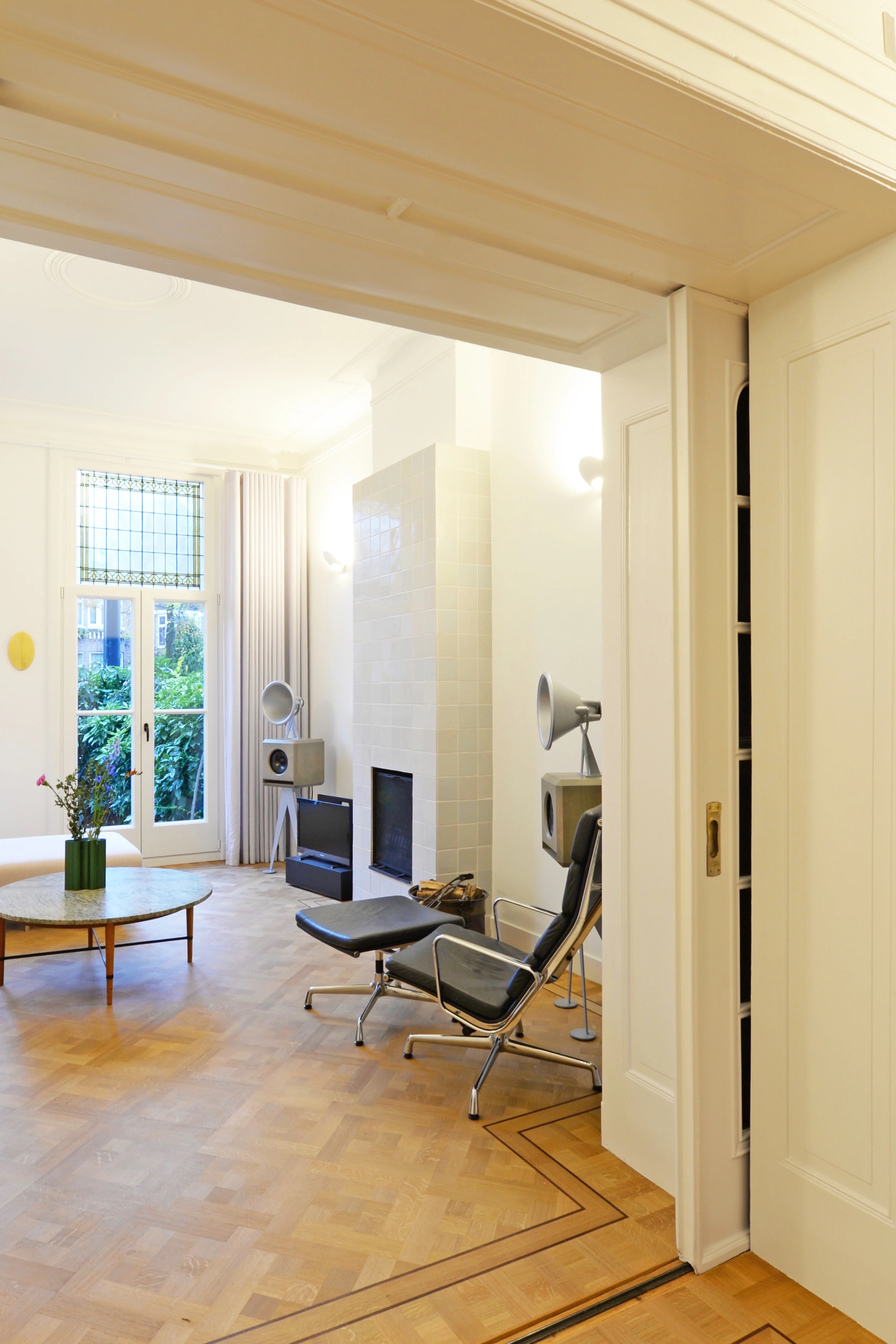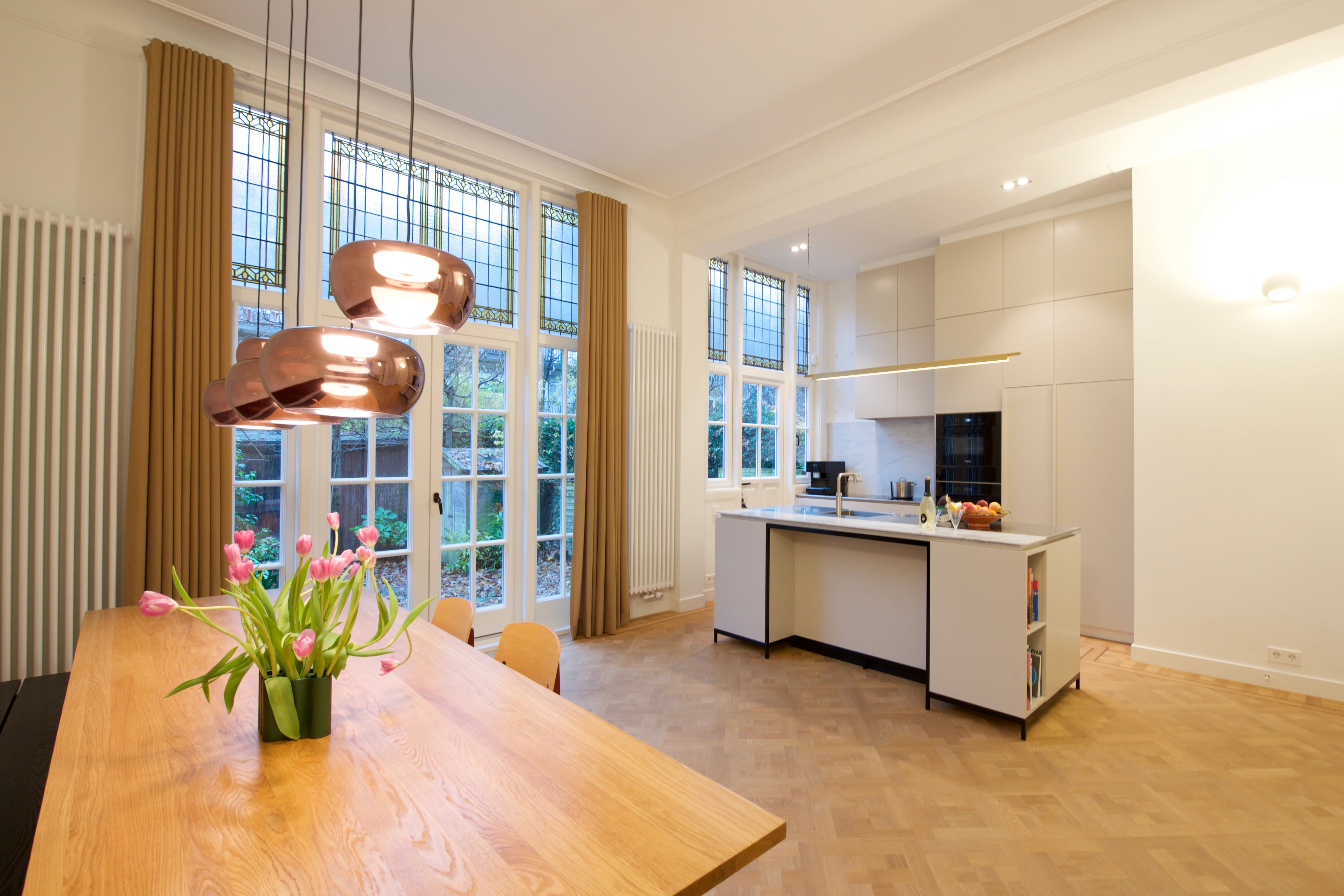 In dit jaren 30 huis in Amsterdam komen twee werelden samen: authentieke elementen en gloednieuwe ruimtes; vintage meubels en modern maatwerk, hexagonale vloertegels en hanglampen van glas. De fijnste aanwinst is de leefkeuken, waar je tot diep in de nacht heerlijk kunt vertoeven en waar je de hele dag door spelletjes kunt doen. Het is een echt familiehuis geworden, met mooie oorspronkelijke en nieuwe details. Dit huis is volledig verbouwd en gerenoveerd; AMstudio heeft dit hele proces ontworpen en begeleid. Zo is de indeling op de begane grond rigoureus aangepast: de keuken is vergroot, wanden zijn verplaatst en de vloer en het glas-in-lood zijn hersteld naar de originele staat. Op de eerste verdieping, die zowel als slaap- als werkverdieping fungeert, zijn kasten op maat ontworpen. Op de zolderverdieping heeft AMstudio kinderkamers en een eigen vrolijke badkamer met een speciaal ontworpen vloer gerealiseerd. Onderdeel van de opdracht was het lichtontwerp, de kleuren en de volledige textiele aankleding. AMstudio beheerst ook deze professionele expertise.