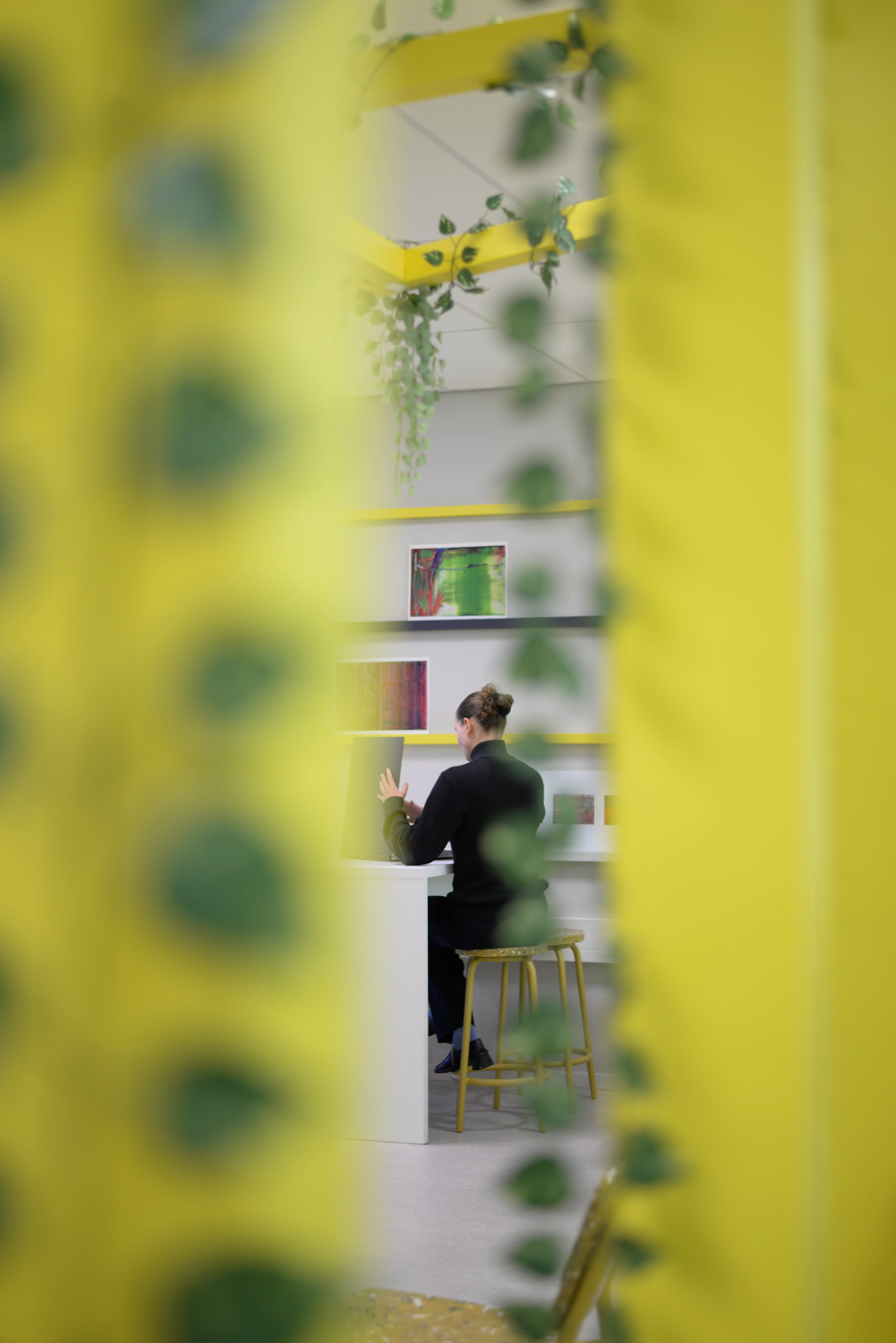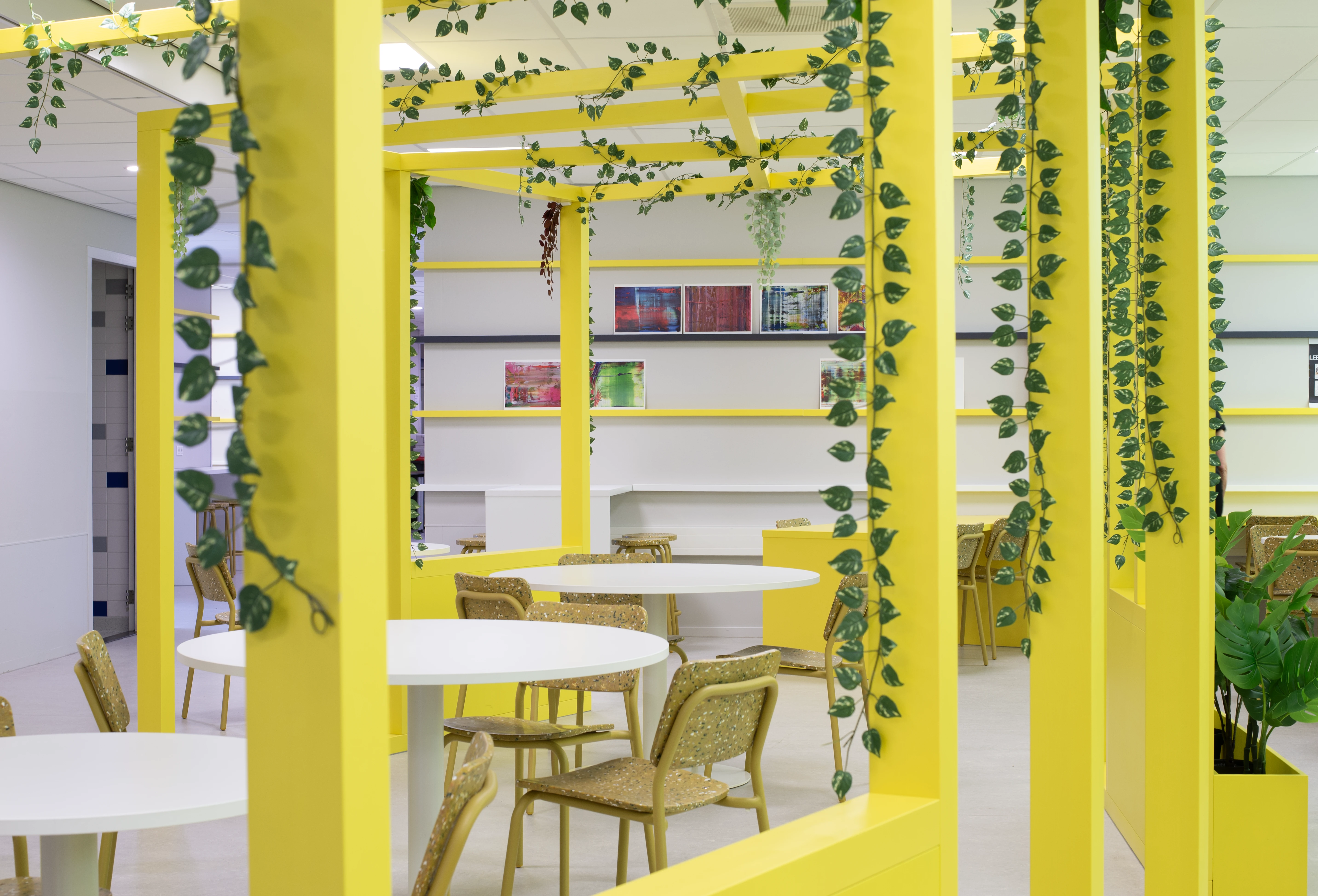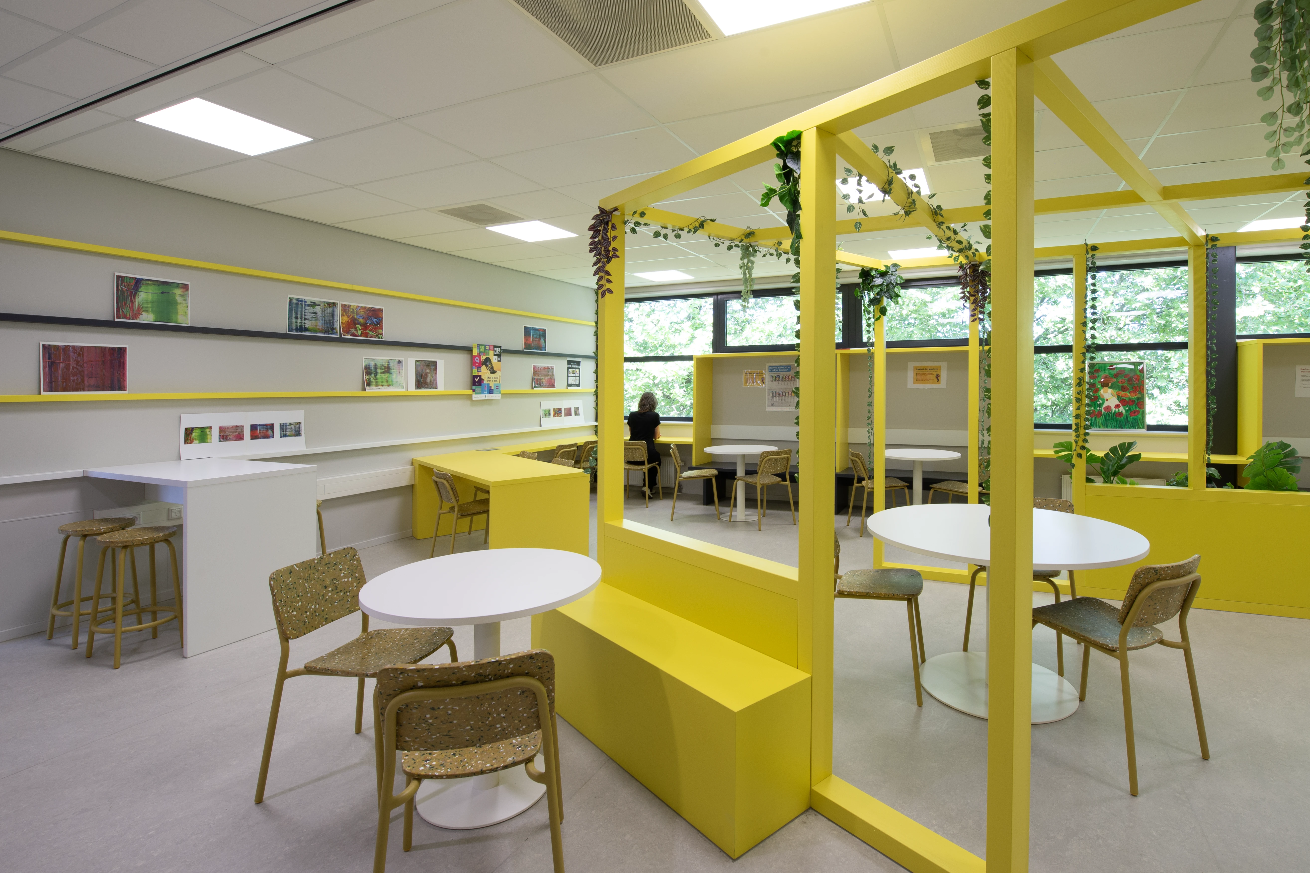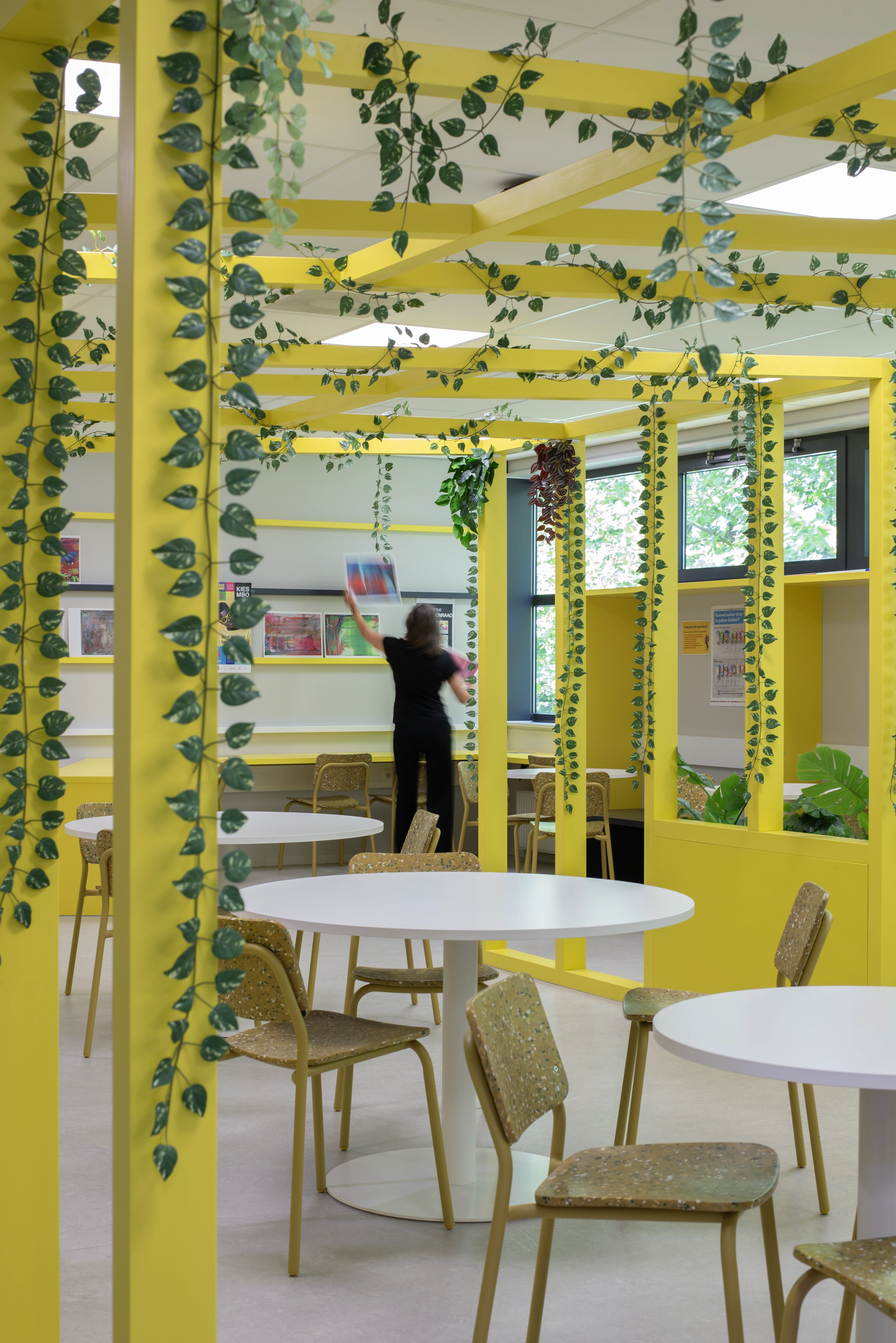 Leerlingen willen een ruimte die bij hen past. Daarom creëren we een vrijstaand houten frame voor geborgenheid, aangevuld met gekleurde ribben aan de muur. Hier kunnen leerlingen hun eigen werk presenteren, waardoor een levendige, kleurrijke en inspirerende leeromgeving ontstaat.
